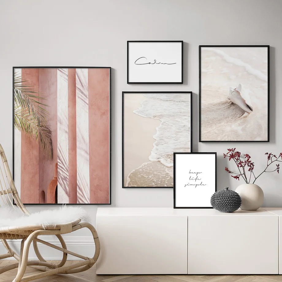 Настенная картина с изображением пляжного пейзажа, постер с розовыми тенями и пальмовыми листьями, Картина на холсте с золотой дверью, скандинавский Декор для гостиной и дома