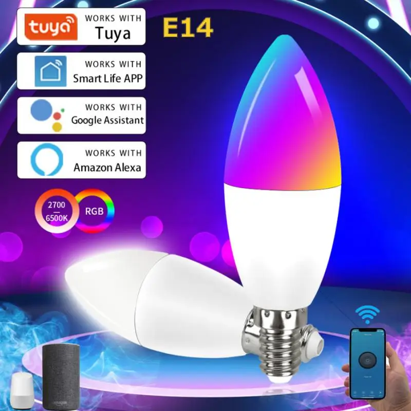 Умная Светодиодная лампа E14 Tuya RGB + CW + WW с регулируемой яркостью, светодиодная лампа-свеча с ночным голосовым управлением и Alexa Google Home Smart Life, 5 Вт, 7 Вт, 9 Вт