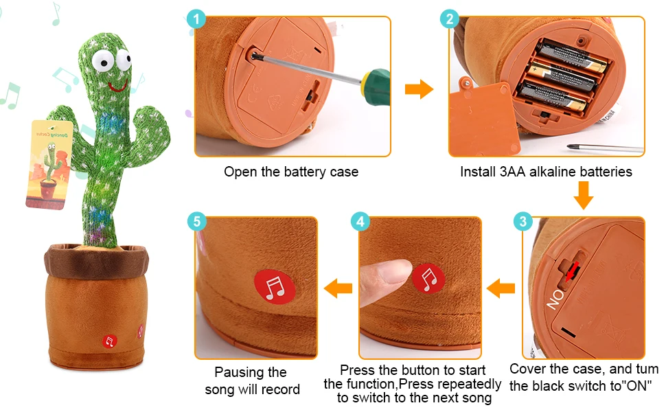 4. Левая этикетка: Длительное нажатие для записи, максимум 15 секунд и нажатие, чтобы воспроизвести звук --- правая этикетка: Нажмите, чтобы воспроизвести музыку, вы можете записать после приостановки песни, повторяющаяся игрушка-кактус и кактус говорящая игрушка