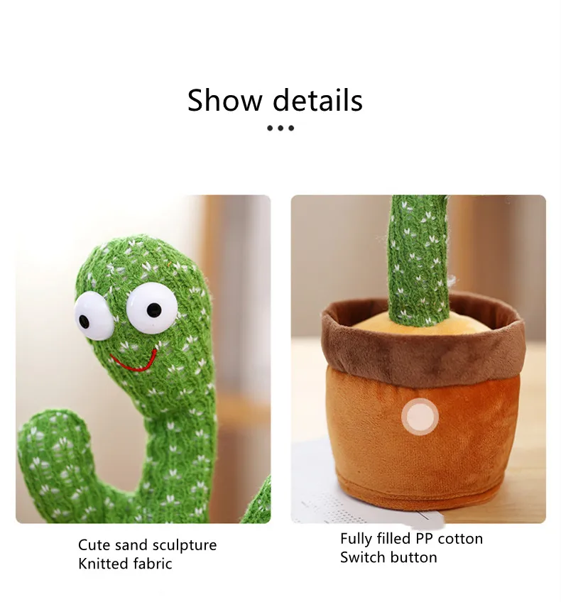 Говорящий и танцующий кактус ---- танцующий кактус поет несколько веселых песен ---- танцевальный кактус повторяет то, что вы говорите Смешные кактус танцы и пение кактус Непоседа игрушки ---- кактус плюшевая игрушка цель подарка: самый подходящий подарок на день рождения для детей. Веселая музыка и танцы очень подходят для создания приятной атмосферы и подходят для вечеринок. Праздники, рождественские подарки, подарки ко дню матери, прайм-дню, рождественские подарки, подарок на день независимости, основные подарки на день рождения, очень подходит для праздничных подарков и подарков-сюрпризов для подружек.