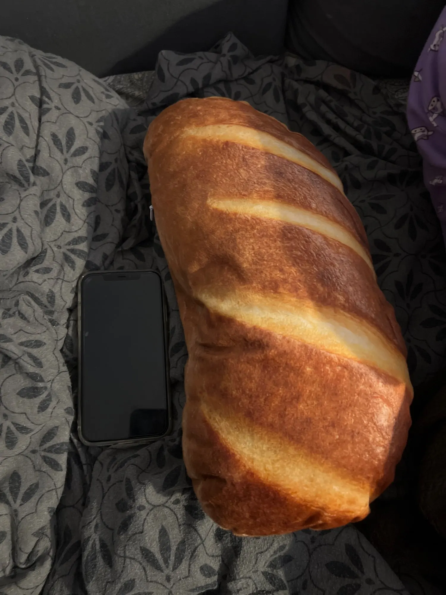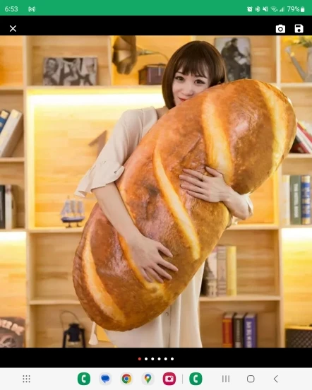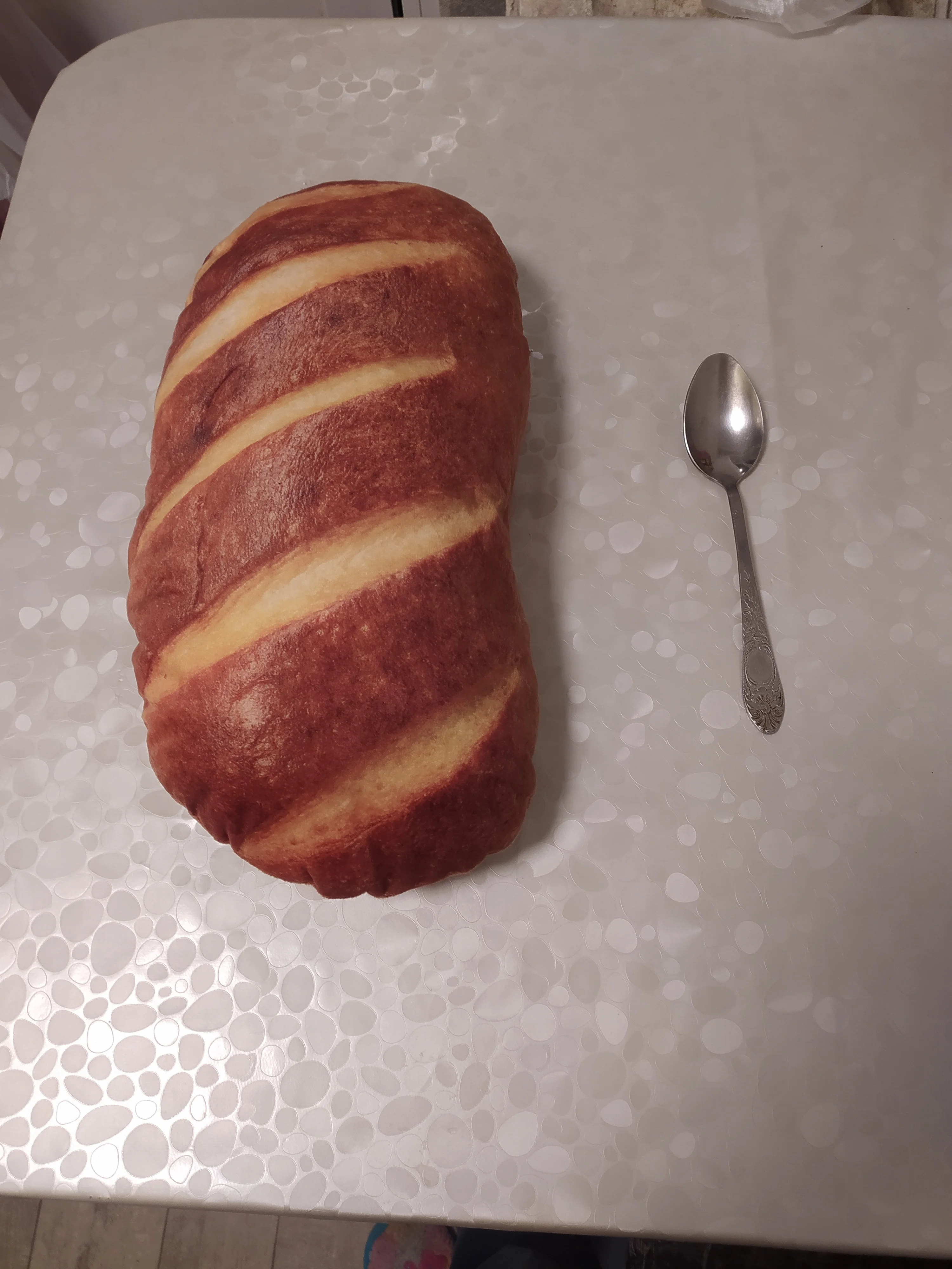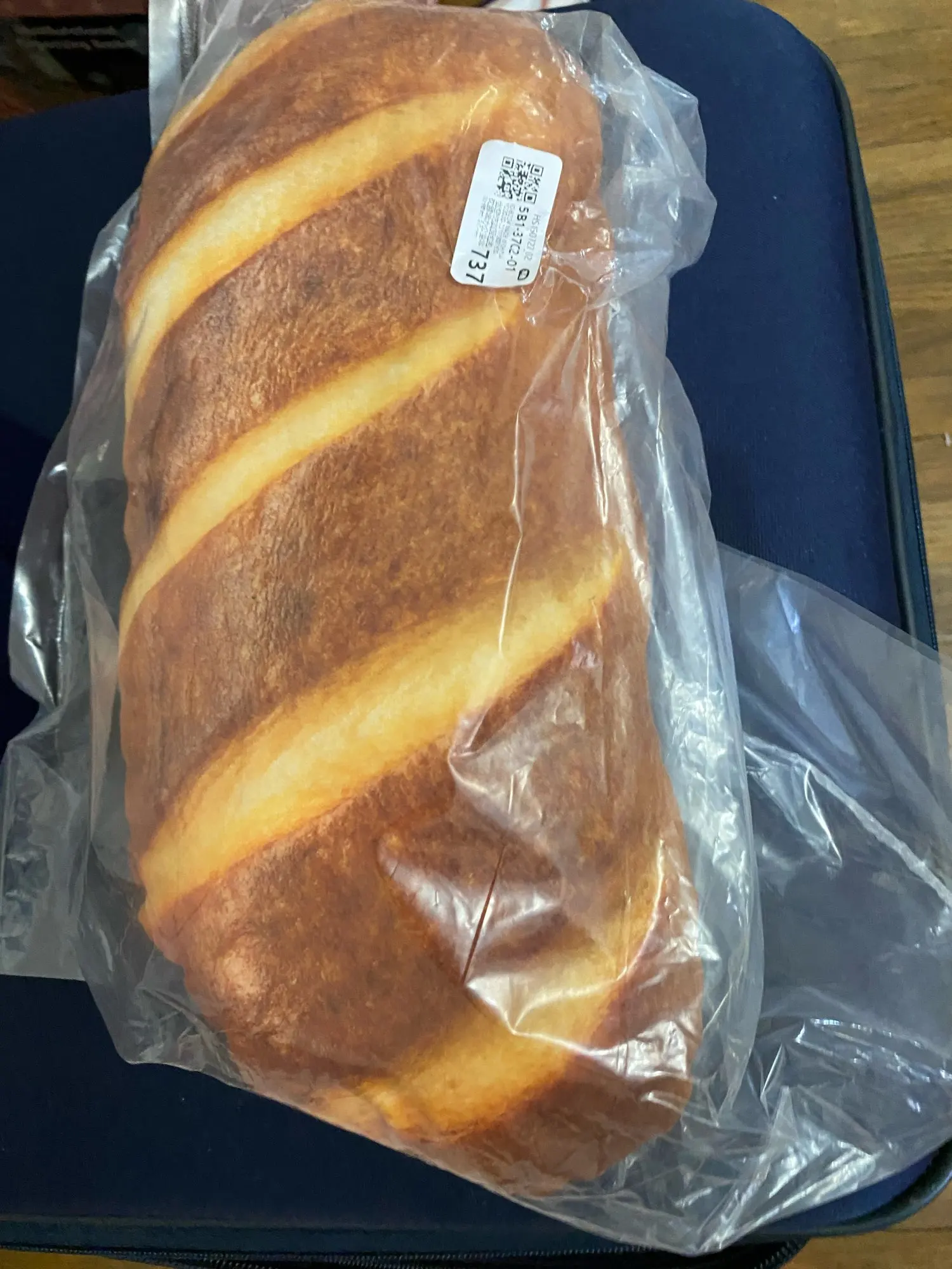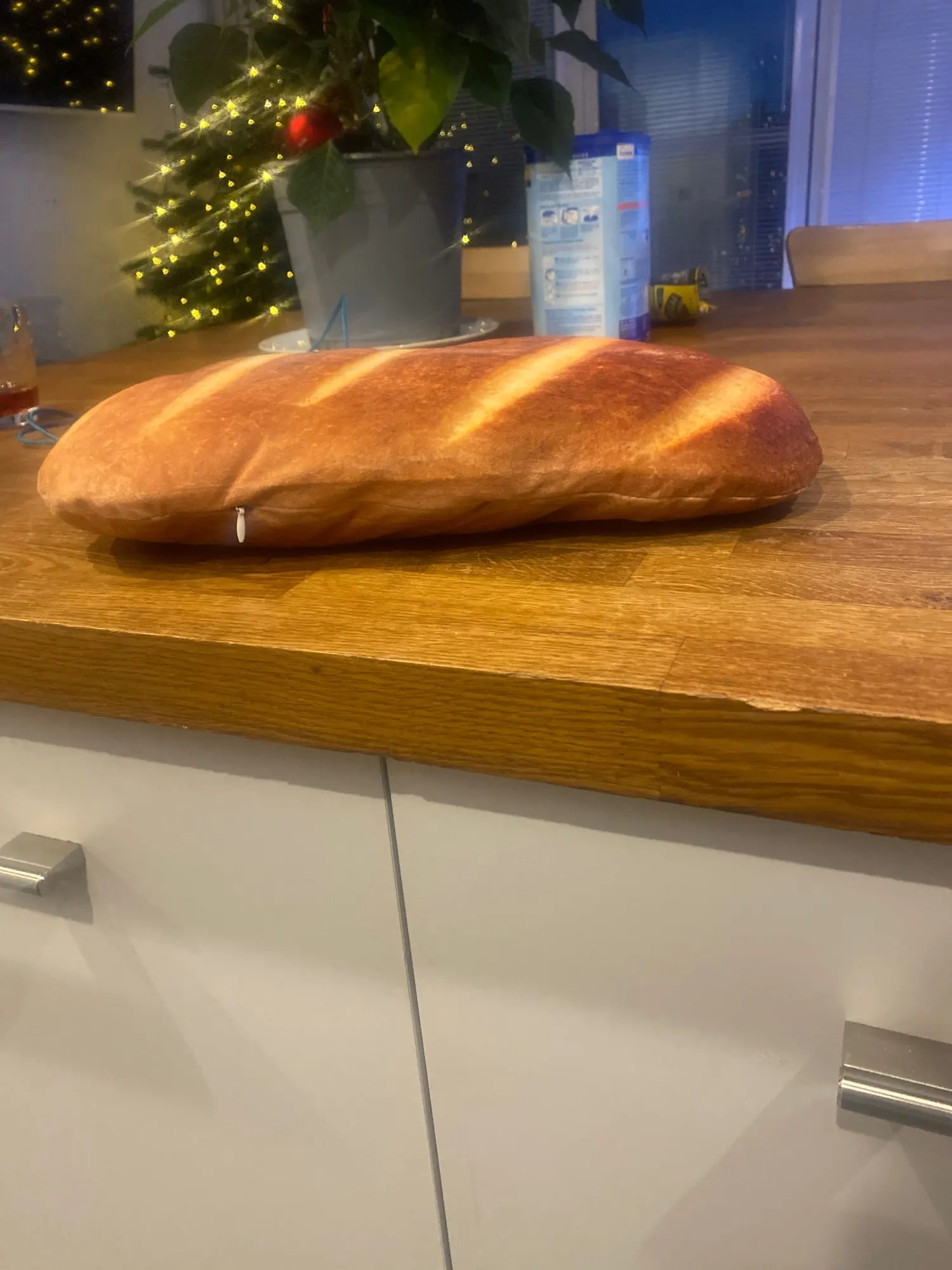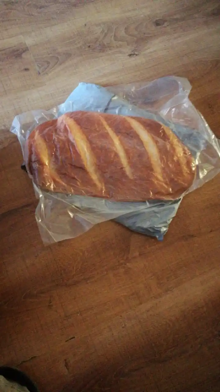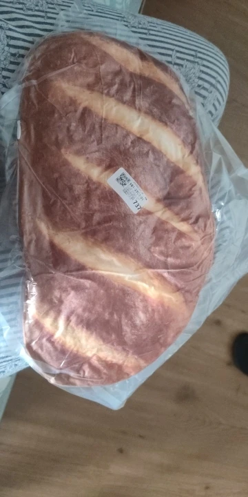 Очень реалистичный батон (подушка). Не отличить от настоящей. Долго смеялись. Размер в длину сантиметров 30 ть.