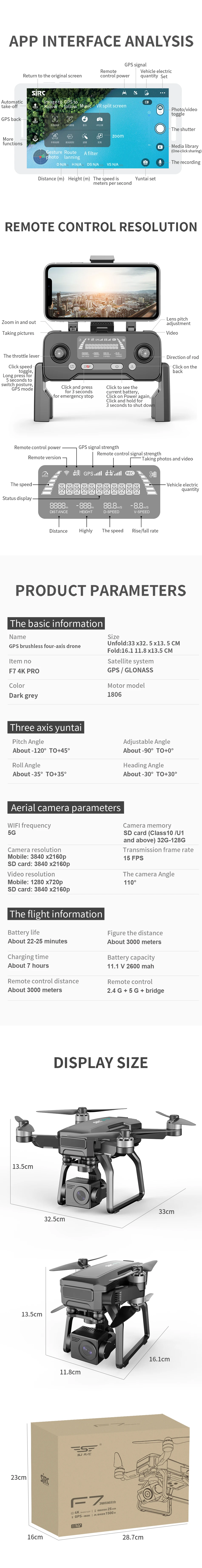 Номер товара: F7 4K ProЦвет: темно-серыйЧастота: 2,4G (пульт дистанционного управления) и 5G (мобильный телефон)Аккумулятор дрона: 11,1 В 2600 мАчРасстояние управления: 3000 м (открытый и свободный, зависит от окружающей среды и мобильного устройства)Wi-Fi расстояние передачи изображения: 3000 м (открытый и свободный, в зависимости от условий и мобильных устройств)Время полета: около 22-25 минВремя зарядки: около 7 часовUsb-зарядка: 5 В/3 АРежим зарядки: USB type-CВес изделия: 547 гПульт дистанционного управления Управление Батарея: 3,7 V 1500mAhПередатчик Время работы: около 2,5 часовКамера: 3-осевой электронная стабилизация Gimbal & EIS Профессиональный настоящий 4K КамераОбъектив камеры: 110 °Разрешение фото (приложение) : 4K 3840x2160PРазрешение видео (приложение) : 1280x720PРазрешение фото (sd-карта) : 4K 3840x2160PРазрешение видео (sd-карта) : 4K 3840x2160PЧастота кадров: 15 кадров в секундуФормат фото: JPGФормат видео: MP4Механический диапазон и диапазон управления:Угол поворота: -30 ° - + 30 °Угол рулона: -35 °- + 35 °Угол наклона: -120 °- + 45 °Регулируемый угол: -90 °- + 0 °Съемка жестов: 1-3 мРаспознавание изображений Следуйте за мной: 3-10 мGPS следуй за мной: 10-100 мSd-карта поддерживает 32G-128G (не входит в комплект)Версия системы мобильного устройства: iOS 8,0 или более поздняя версия/Android 4.4.4 или более поздняя версия