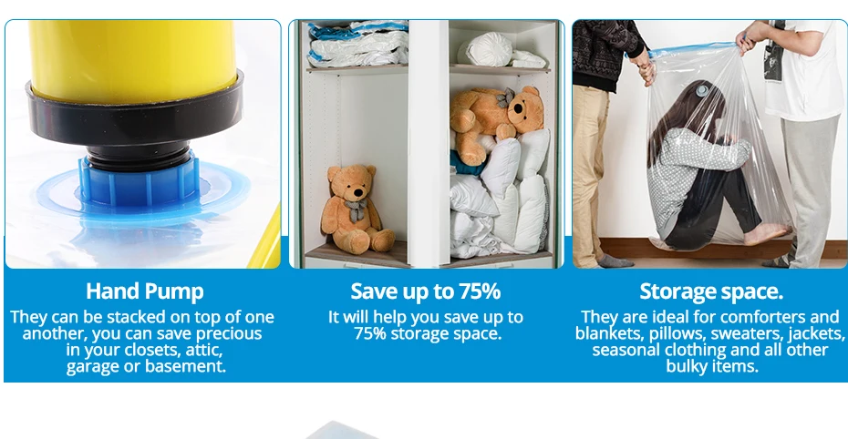 Заполните вакуумный мешок для хранения одежды, уплотните, плотно Положите ручной насос или пылесос в клапан, пока он не высасывает весь воздух. ППодходит для одежды, штор, полотенец, Ковров, одеял, одеял, матрасов, одеял, постельных принадлежностей и т. Д.