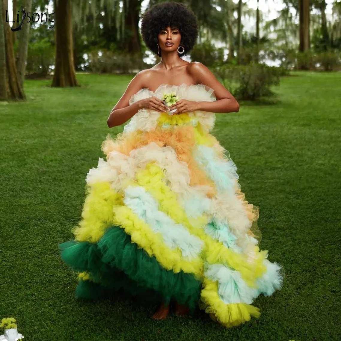 Шикарное красочное многослойное Тюлевое платье, Длинные вечерние платья без бретелек, радужные платья ярких цветов для выпускного вечера, одежда для фотосессии на заказ