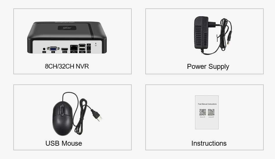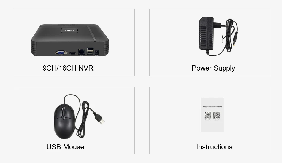 1 * 8CH/ 9CH/16CH H.265 NVR1 * USB мышь1 * Адаптер питания DC12V для NVR1 * Руководство пользователя
