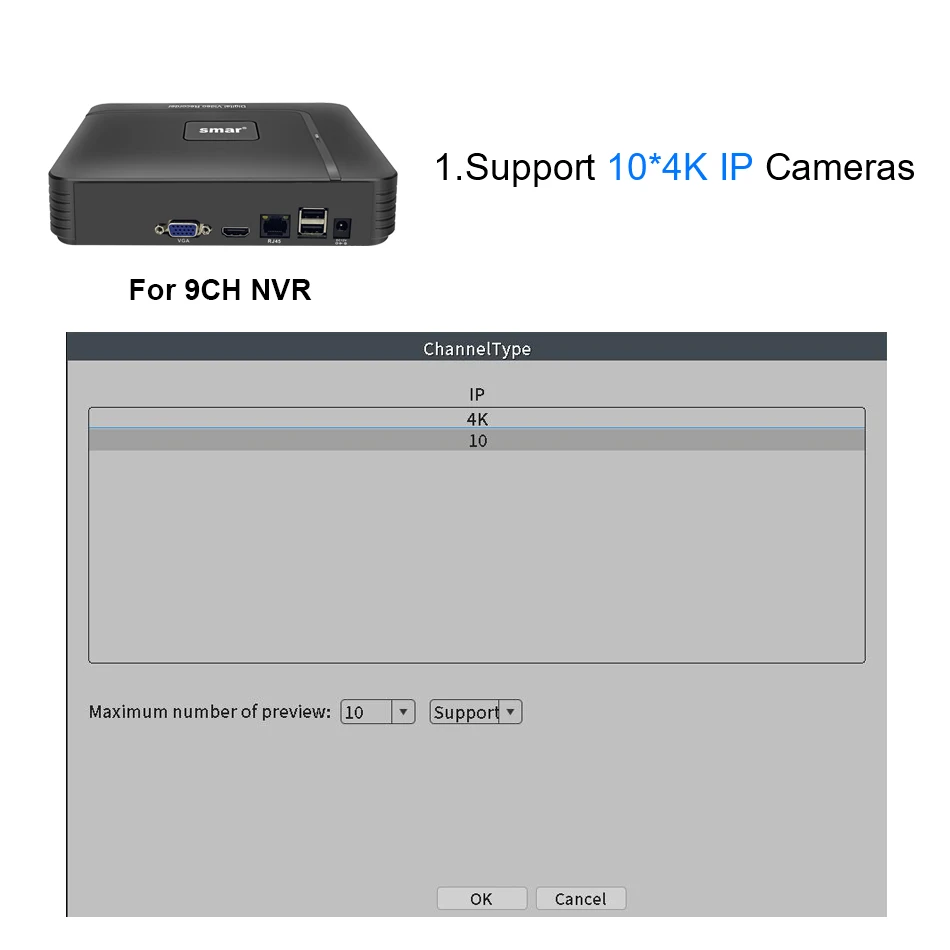 1. 9 каналов: на самом деле 10 каналов, чип Hi3536;2. Максимальная поддержка ip-камеры 10*4K(8MP)3. Поддержка адаптера Wifi, модель адаптера Wifi: 76014.10CH(Hi3536) плата макс. поддерживает дисплей 4K5.10CH плата NVR, пожалуйста, выберите Видео вход: 9CH (заказ)
