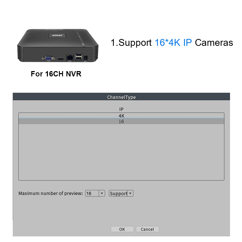 8CH NVR отличается от 9CH/16CH NVRDifferences1: 8CH Материал корпуса: металл боты (белый), 9CH/16CH Материал корпуса: пластик (полностью черный)Differeance2: Видео вход (IP): 8CH Макс поддержка 9*4K ip-камеры, 9CH Макс поддержка 10*4K ip-камеры, 16CH Макс поддержка 16*4K ip-камеры.То же самое: другие функции такие же, как H.265 Сжатие видео, обнаружение движения, электронная почта сигнализация, несколько языков ....Пожалуйста, проверьте картинку следующим образом: