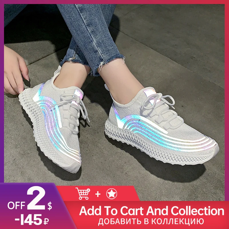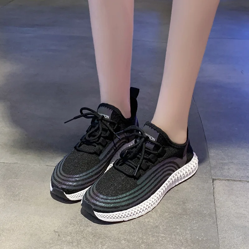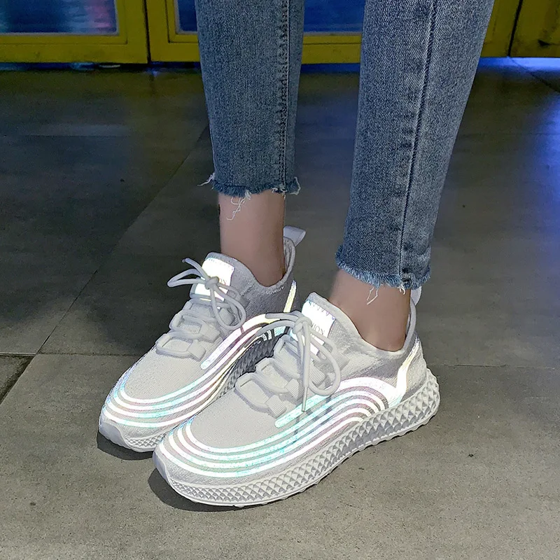 Кроссовки женские Светоотражающие, дышащие вязаные нахлыстом, на платформе, модная повседневная обувь со светоотражающими цветами