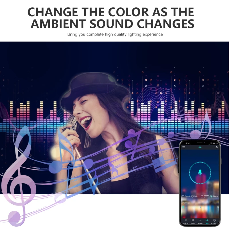 Встроенный высокочувствительный микрофон плавно синхронизируется с вашей любимой музыкой, производящей динамичный уникальный светильник. Улучшите свои вечеринки и ночи с красочным музыкальным фоном.