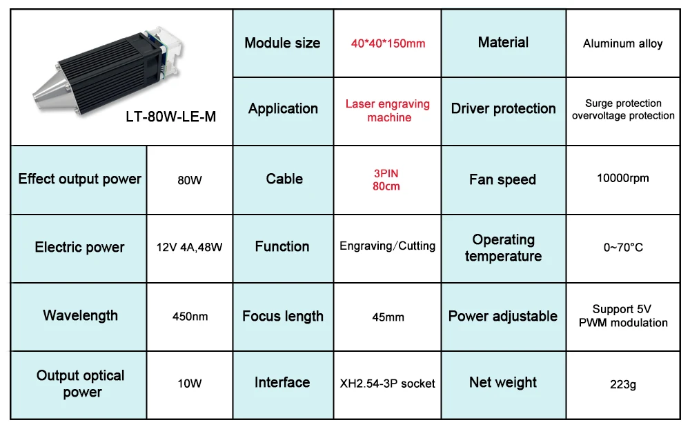 Лазерный модуль высокой мощности 450 нм 80 Вт-профессиональная версия, фиксированная фокусная головка, лазерная головка для лазерного гравера, инструмент для резки дерева