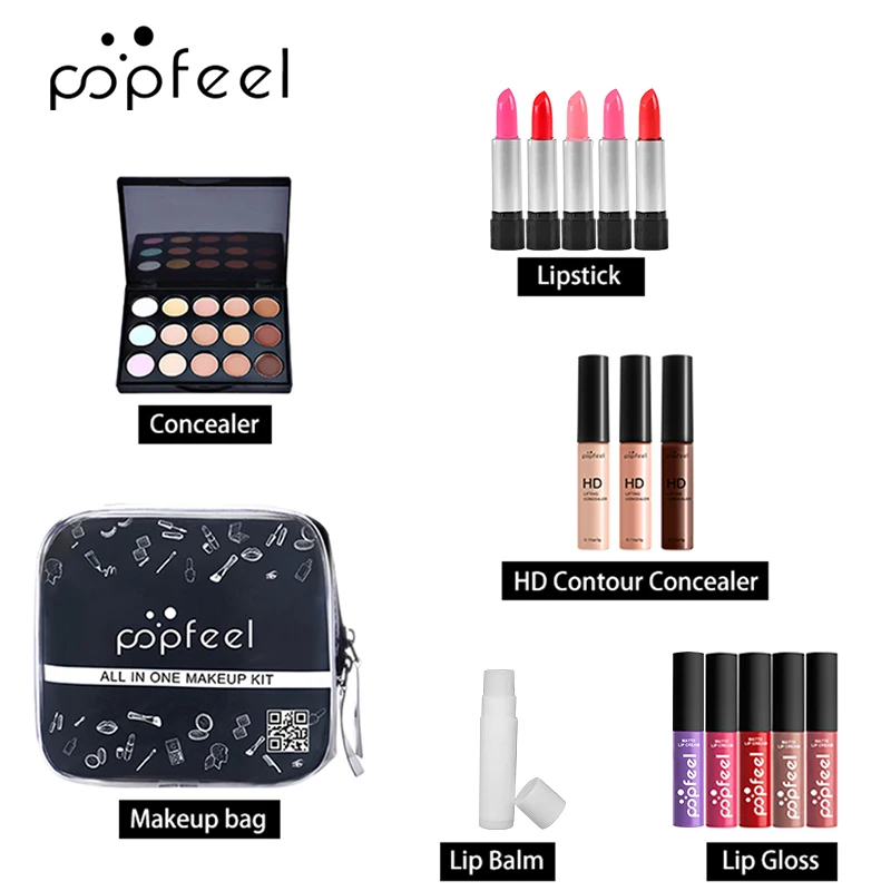 16 цветов Палитра теней x 1,Мини 15 цветов консилер x1,Мини 15 цветов Блеск для губ x 1,Прессованный порошок x1,Грунтовка x 1,Бровей x1,Губная помада x4,Консилер полного покрытия x1,Жидкие тени для век x2,Губная помада x 2,Блестящий x 2,HD консилерx1,Бальзам для губ x1,Жидкий консилер x1,Кисть для макияжа x4,Буфет для макияжа x1,Карандаш для бровей x1,Лак для ногтей x4,Косметичка x1