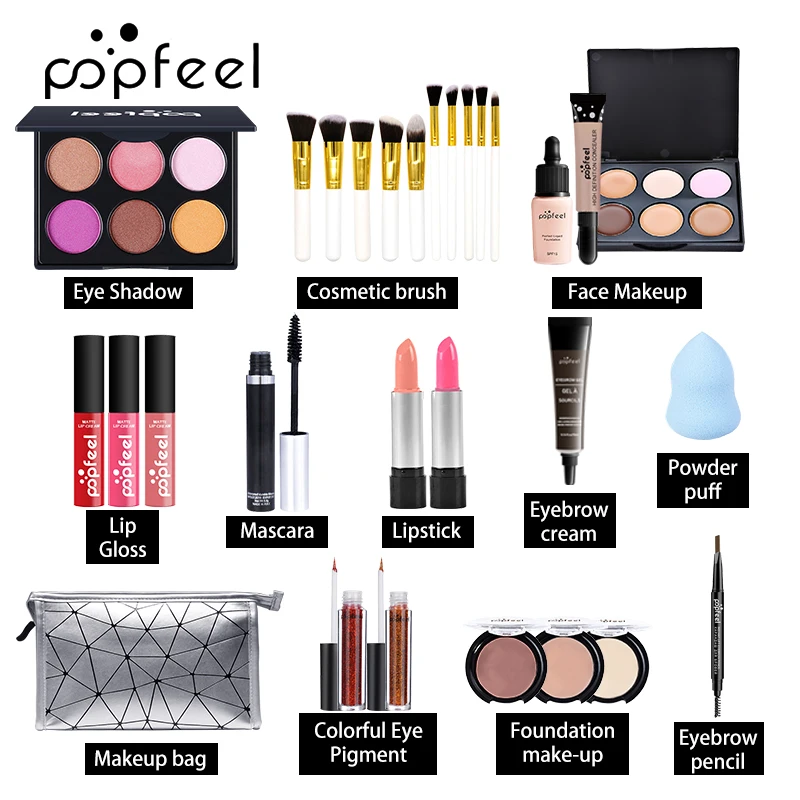 6 цветов Палитра теней для век x1,Кисть для макияжа x10,6 цветов консилер x1,Жидкая Основа x1,Консилер полного покрытия x1,Блеск для губ x3,Тушь для ресниц x1,Губная помада x2,Крем для бровей x1,Порошок Puff x1,Косметичка x1,Красочный пигмент для глаз x1,Основа для макияжа x1,Карандаш для бровей x1