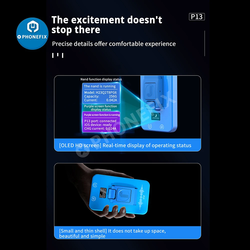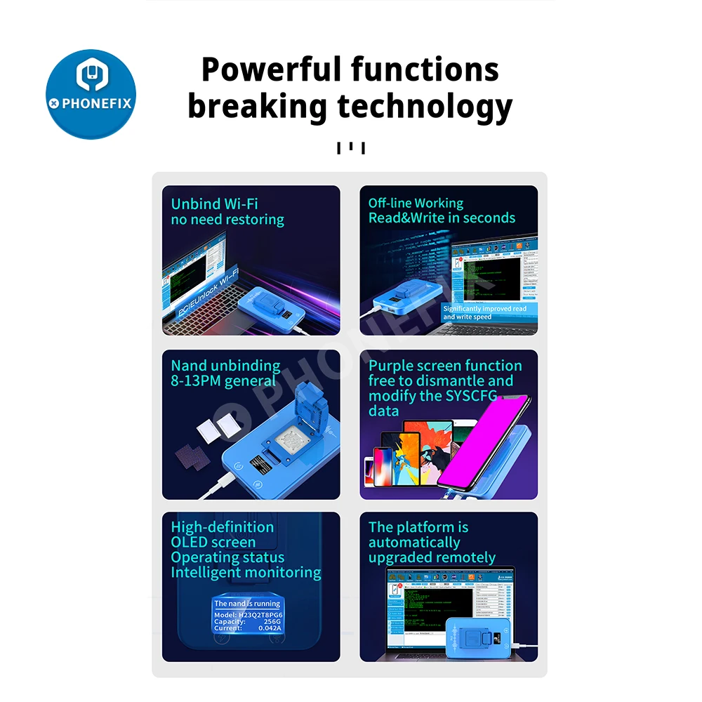 Поддерживает полный спектр устройств ios NAND Disk, Bootcode reflash, syscfg repair. Wifi unlocketc. Более 33 моделей, включая устройства ios ix, поддерживаются коробкой JC P13.