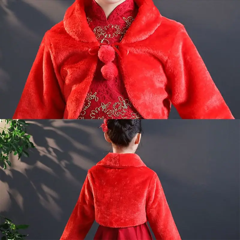Детская утепленная плюшевая шаль принцессы, шаль с цветочным рисунком для девочек, с длинным рукавом, болеро, накидка, накидка для свадьбы, дня рождения, вечеринки, куртка с помпоном и галстуком