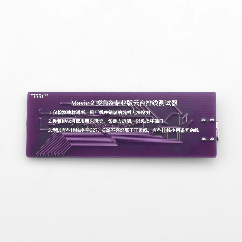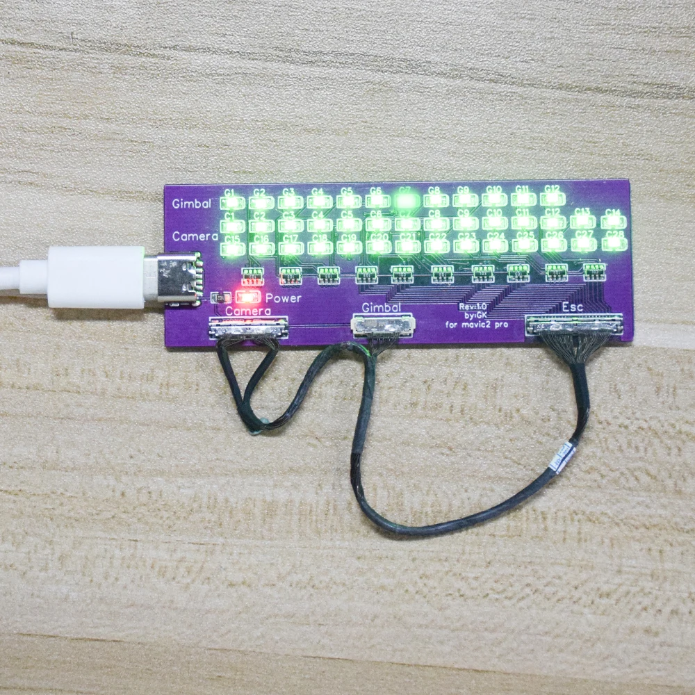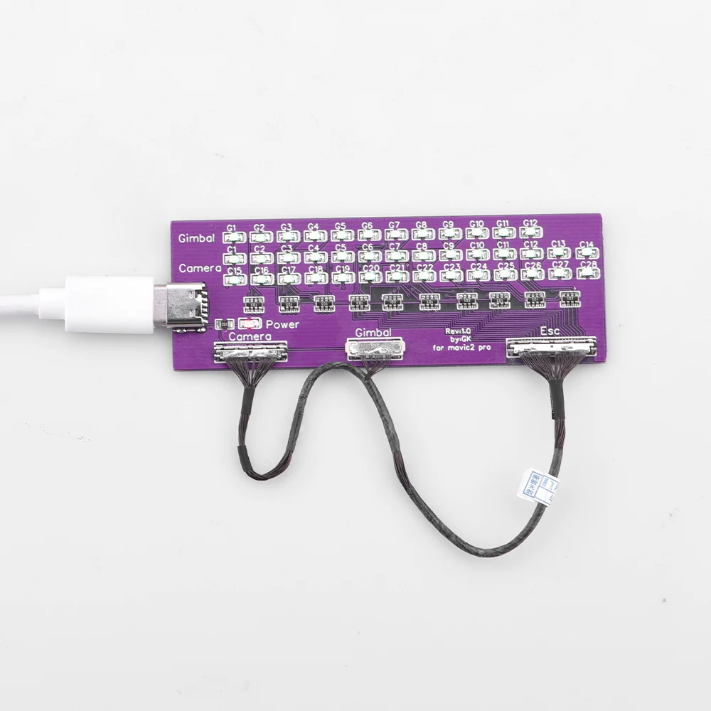 1. Испытательный инструмент для сигнальной линии дрона Mavic 2,2. Вы можете проверить сигнальную линию через светильник на испытательной плате,3. Если свет от 1 до 26 включен, сигнальный провод не поврежден. Если какая-то светильник s не светильник, это означает, что возникла проблема с сигнальным проводом (off светильник s No. 27 и 28 не влияют на работу сигнальной линии).