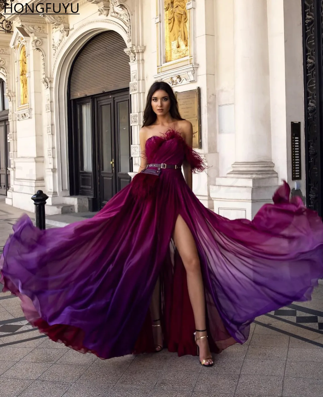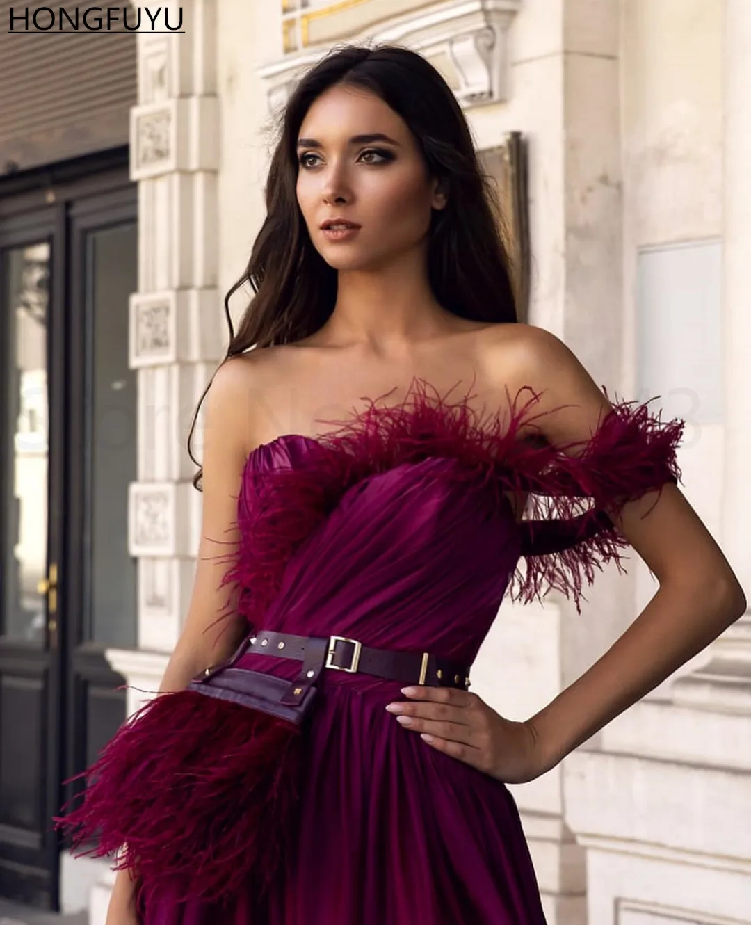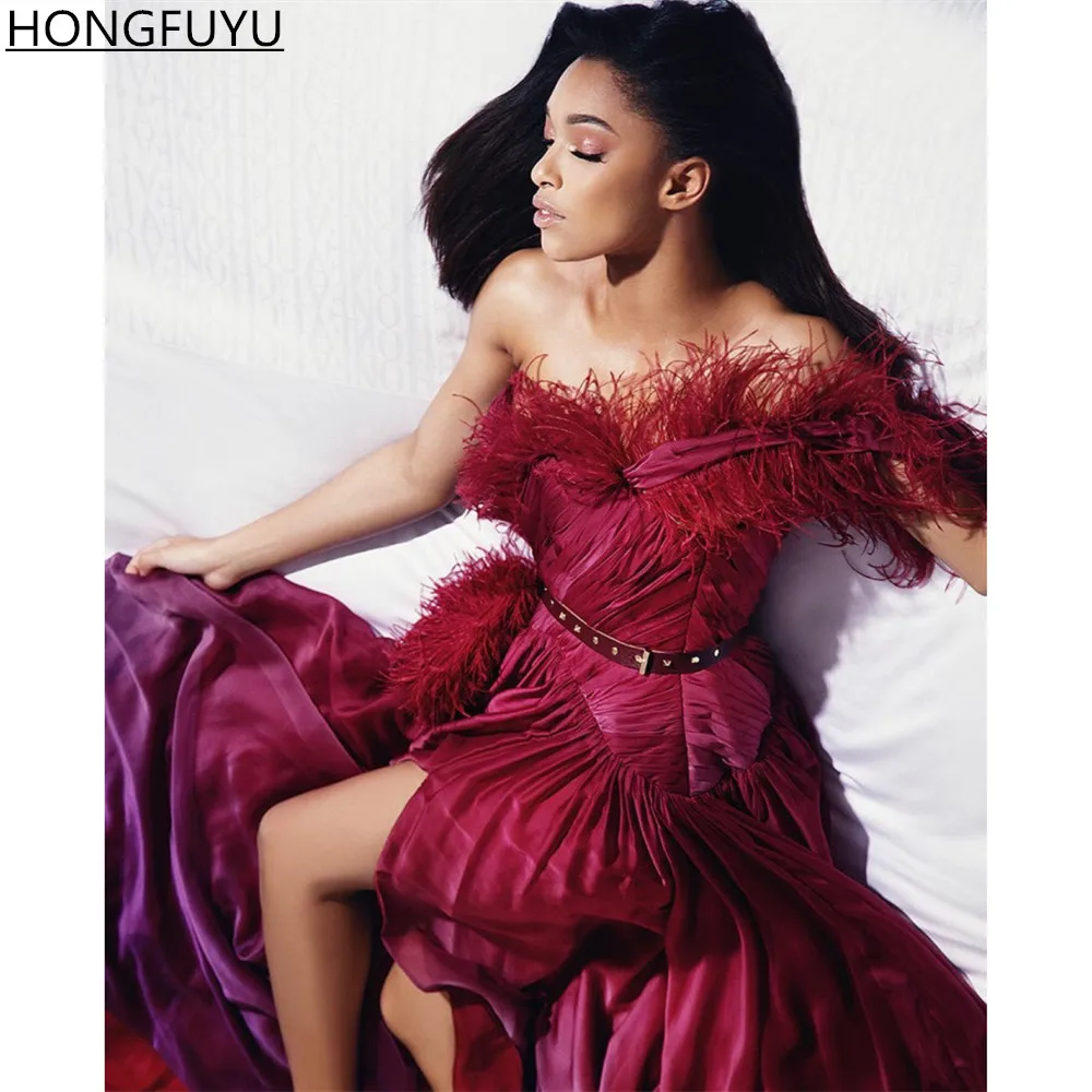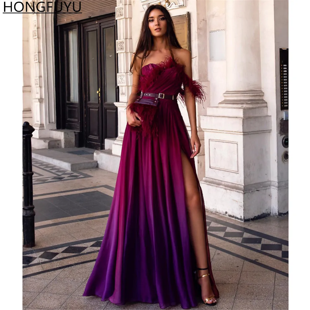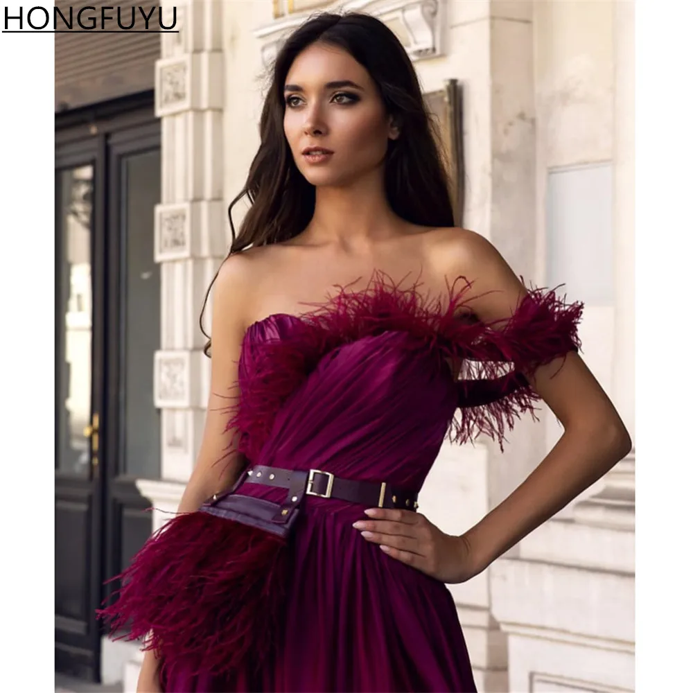 HONGFUYU платья на одно плечо с перьями баской Вечерние Платья С Боковым Разрезом вечерние платья с рюшами шифоновое платье А-силуэта для выпускного вечера