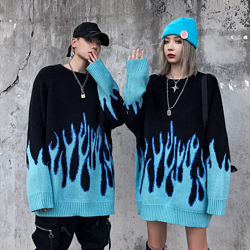 Женский свитер оверсайз с синим пламенем, модный Свободный Повседне...
