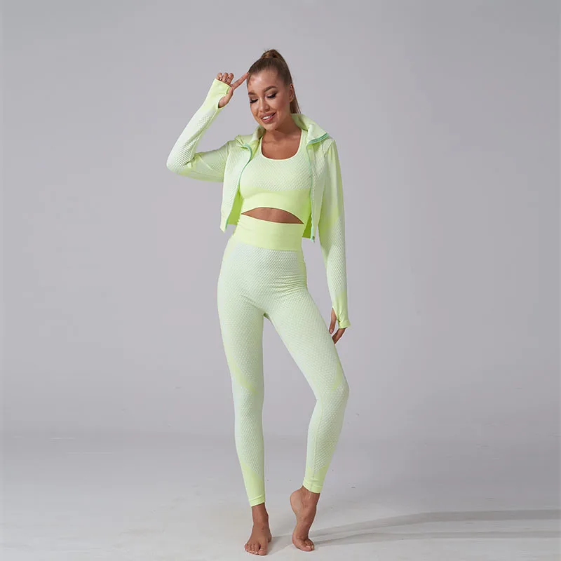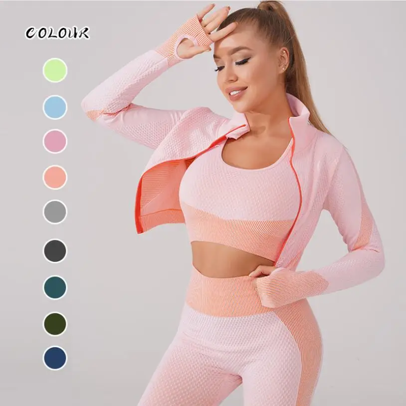Бесшовный комплект из 3 предметов для йоги, рубашка на молнии с длинным рукавом + сексуальный бюстгальтер + леггинсы с высокой талией, спортивная одежда для фитнеса и бега, женские костюмы для йоги