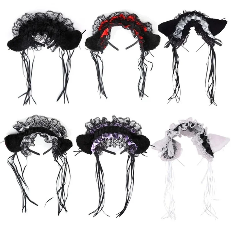 Женский обруч для волос Lolita, кружевной обруч с оборками и кошачь...