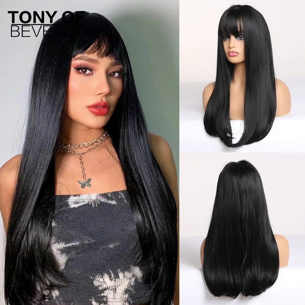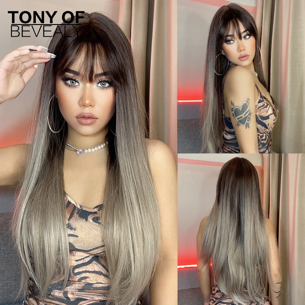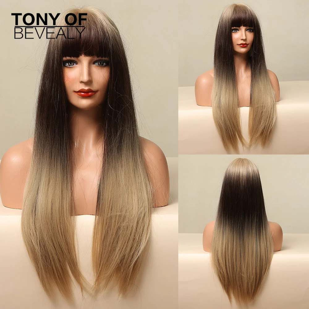 Длинные Синтетические прямые парики Омбре, коричневые, светлые парики с челкой для женщин, натуральные, повседневные, вечерние, термостойкие парики