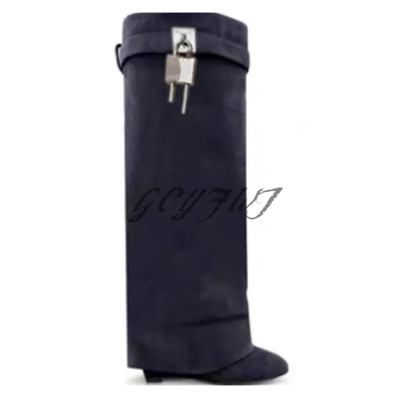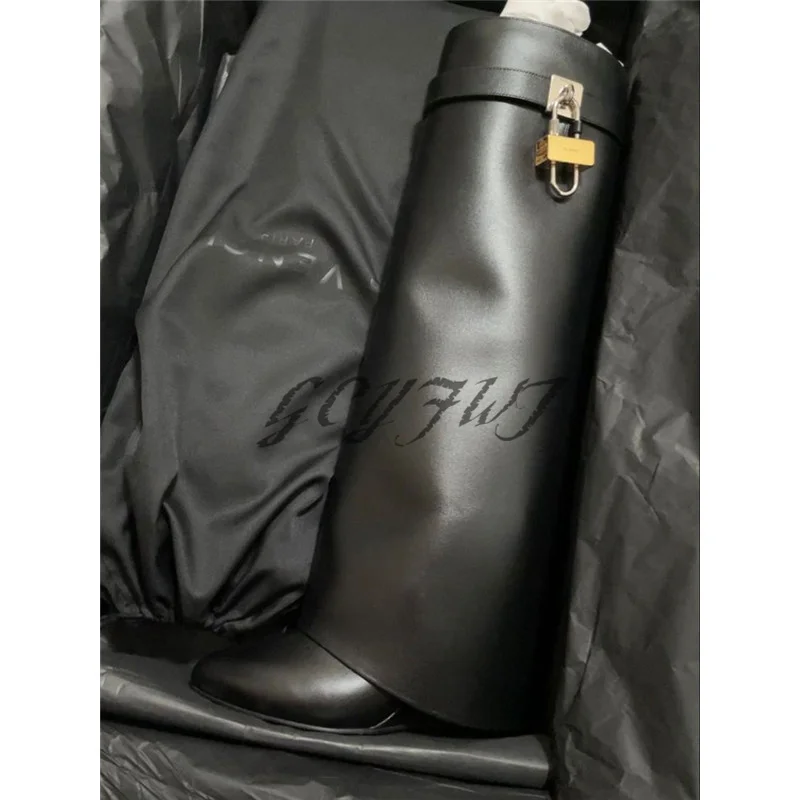 Женские высокие сапоги из натуральной кожи, с металлическим украшением, заостренный носок, без застежки, сапоги на танкетке, модная женская обувь