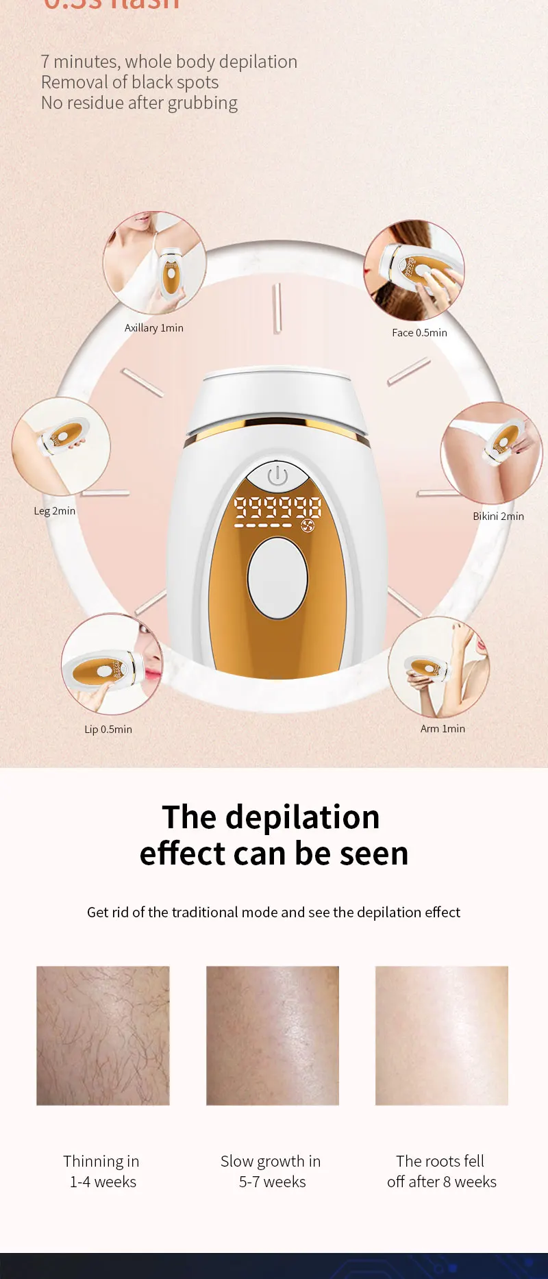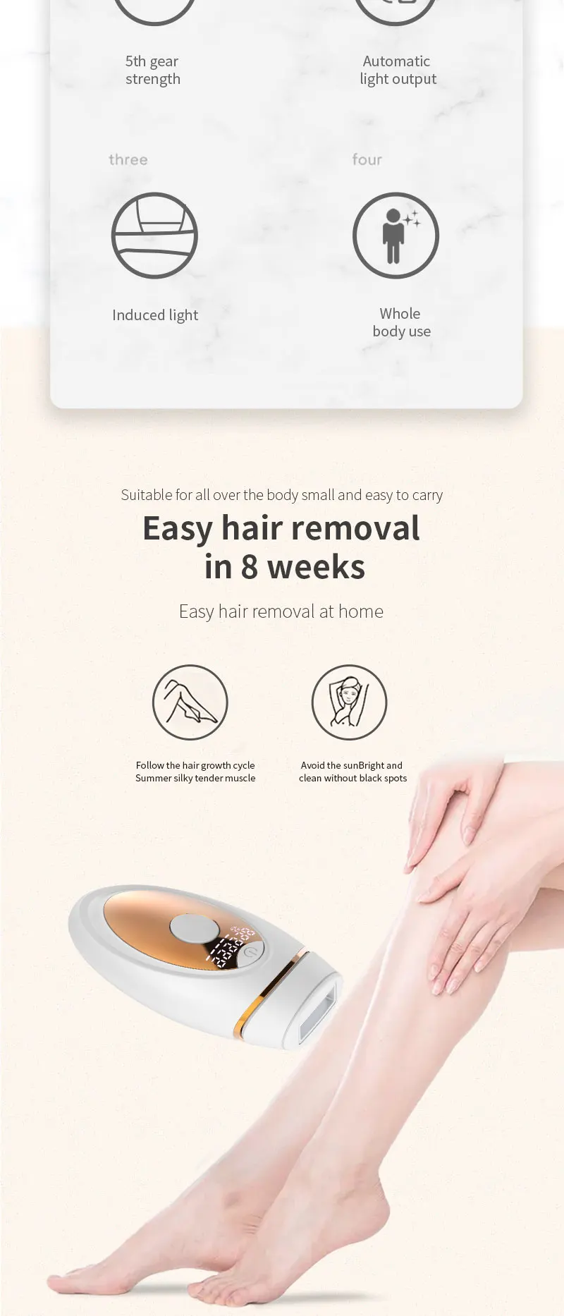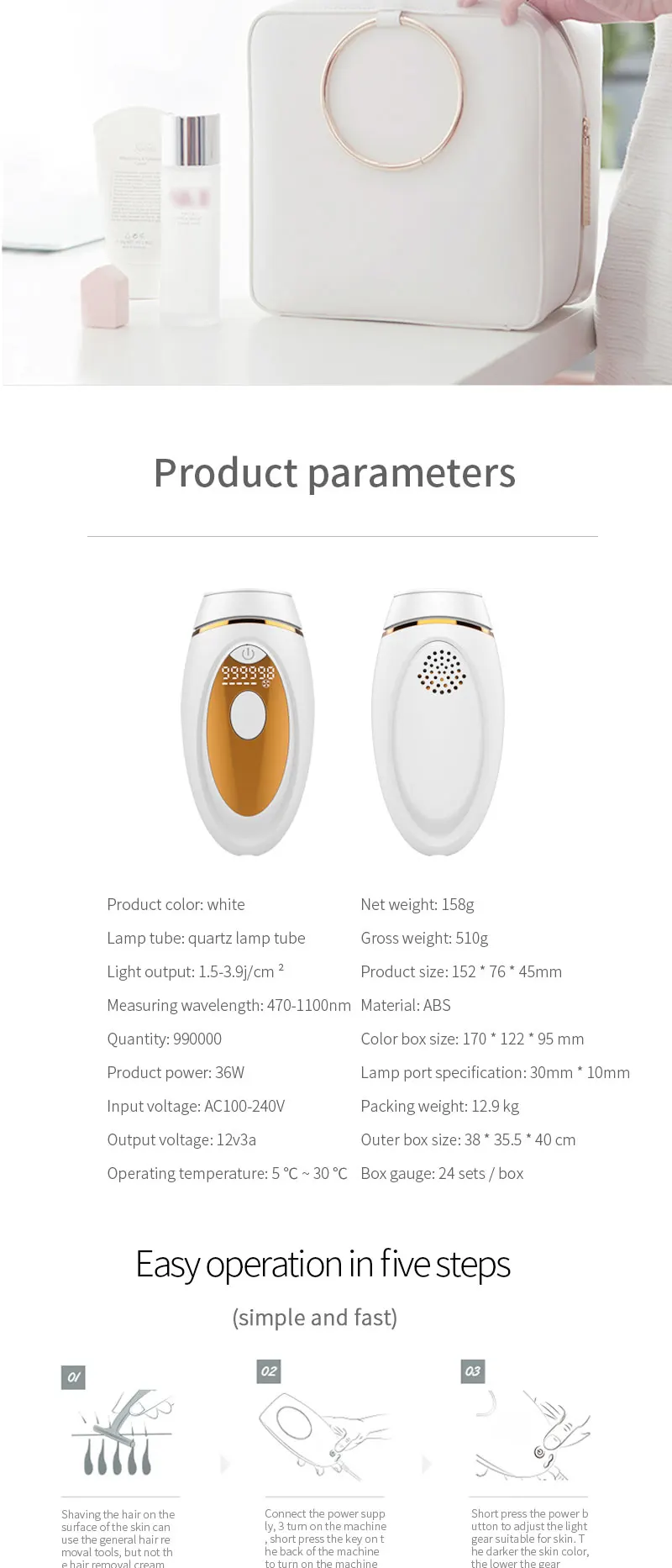 Технические параметры продукта:Светильник: ксеноновая кварцевая трубкаСветильник источник: импульсно-светильникЧастота энергии: 2,3-4.3J/cm⊃ 2;Размер Фокуса: 30 мм * 10 ммДлина волны: 530нм ~ 1100нмСветящийся светильник: 999000 разСпецификация адаптера: AC100 ~ 240V @ DC12V 3AВес: 168 гРазмер: 152*76*45 ммДиапазон рабочих температур: 5 ℃ ~ 30 ℃Диапазон рабочей влажности: относительная влажность 30% ~ 60%Особенности:1,990000 пузырьков вспышки используют лампу, Двухслойное покрытие, безопасно и эффективно.2. Ручной/автоматический двойной режим, мягкое облучение с пятью передачами энергии.3. Съемный держатель лампы с двойной фильтрацией, корпус используется для неограниченного времени.Введение функции продукта⑤ Омоложение кожи• ДепиляцияОбласть применения: волосы на губах, волосы на подмышках, волосы на конечностях, линии на лбу и другие волосы, которые влияют на красоту; Безболезненное удаление волос для людей с черными волосами и темными волосами, но не для белых, белые и золотистые волосы.