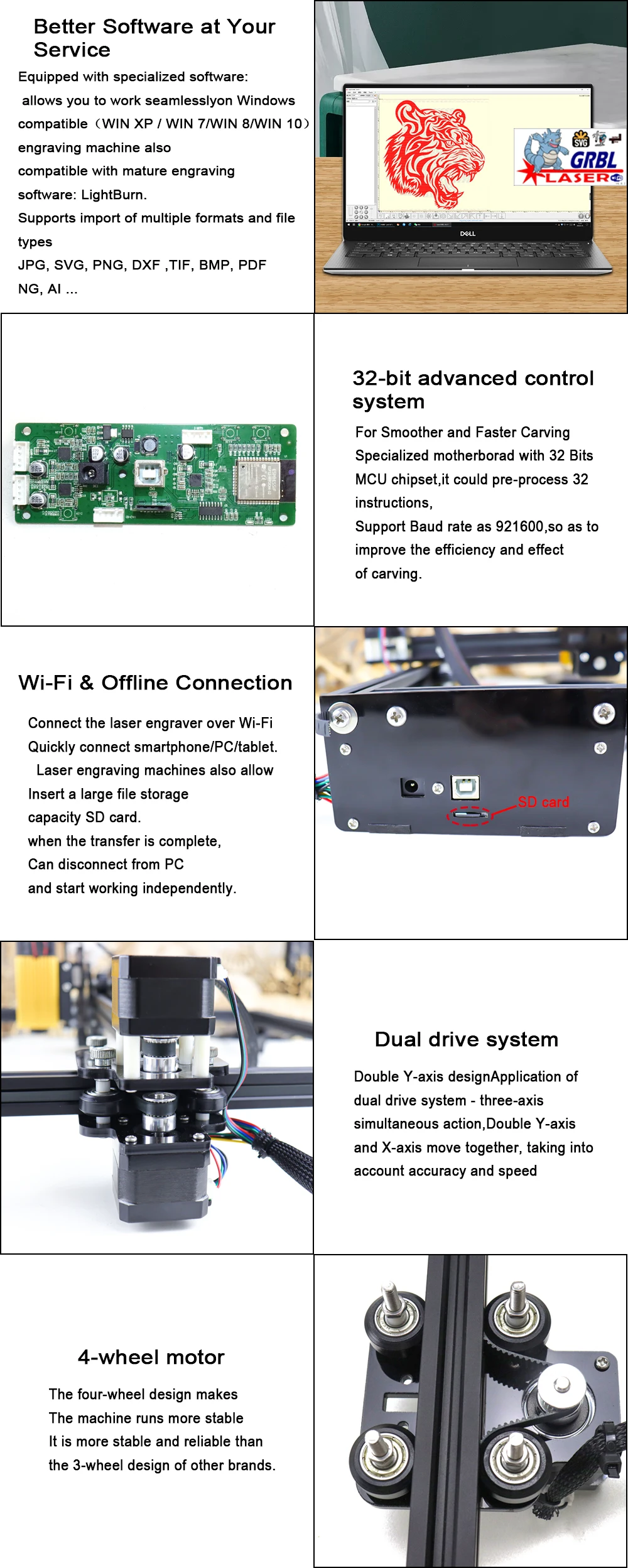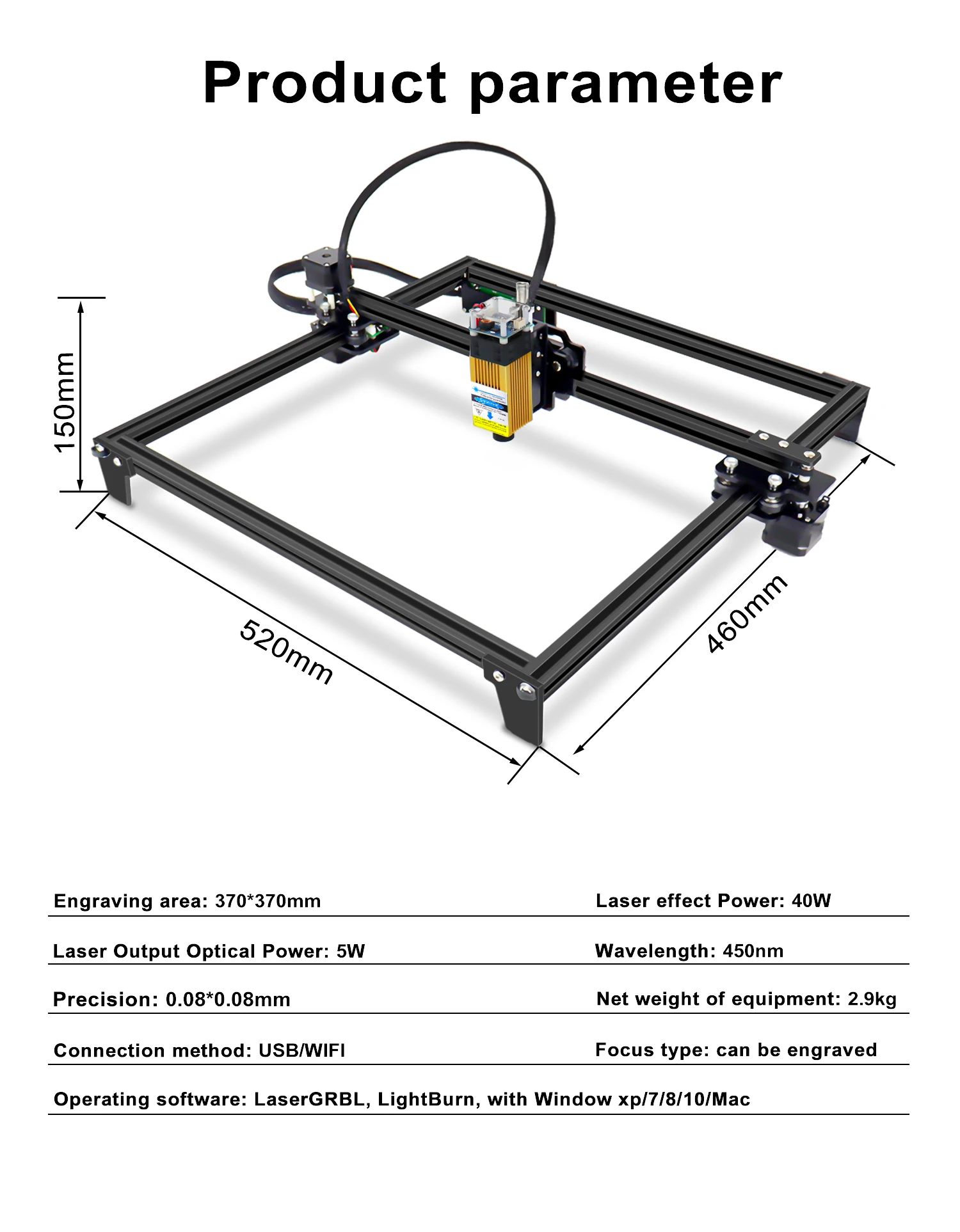 Машина совместима с различными зрелыми гравировальными программами, такими как LaserGRBL, LightBurn, поддерживает Win XP/Win 7/Win 8/XP/Win 10, также поддерживает систему MACs (LightBurn), формат гравировки файлов поддерживает NC, BMP, JPG, PNG , DXF и т. Д.