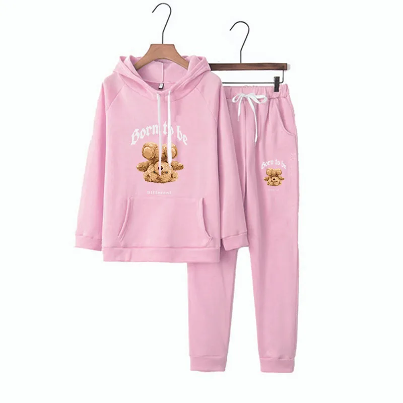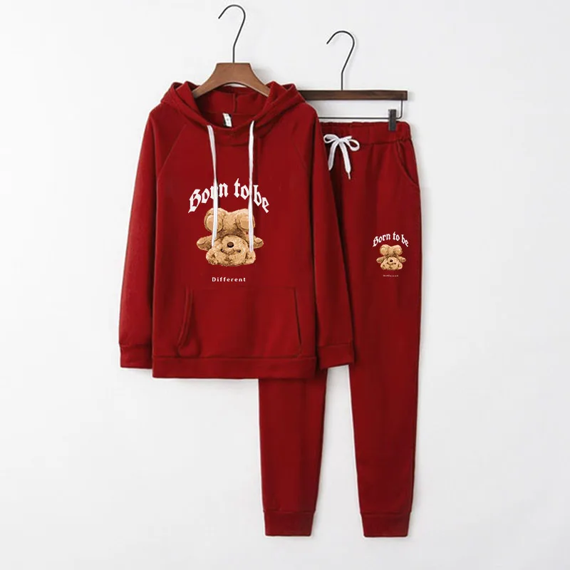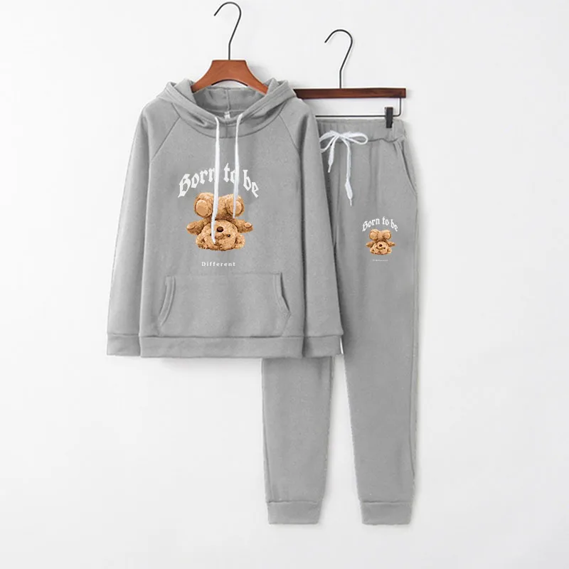 Женский спортивный костюм с принтом медведя, спортивная одежда, комплект с толстовкой и капюшоном, однотонный пуловер с капюшоном и длинным рукавом, комплект из свитера на осень и зиму
