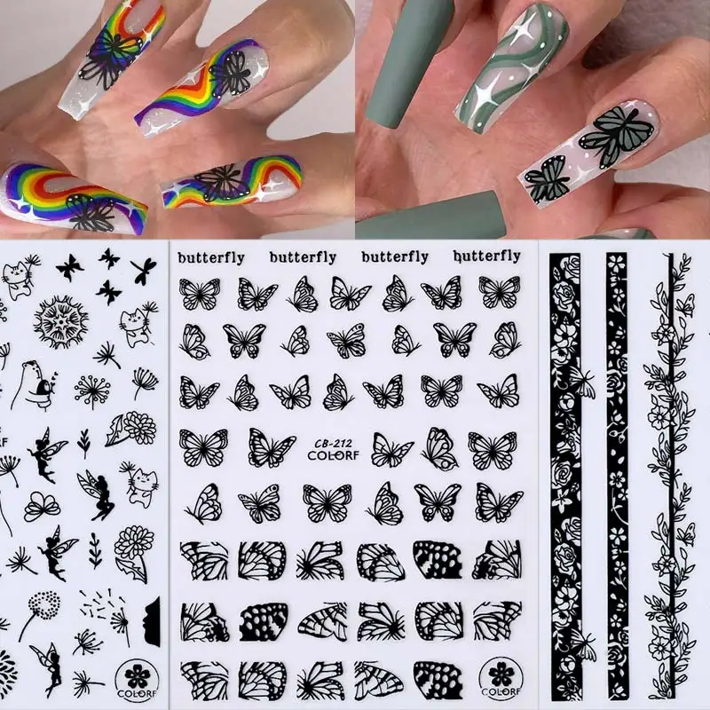 Геометрические линии, черная, белая бабочка, 3D наклейка для ногтей, цветок, золото, сделай сам, наклейки для дизайна ногтей, маникюр, украшения салона