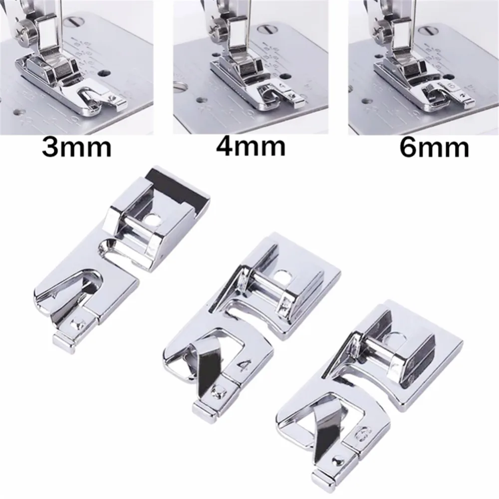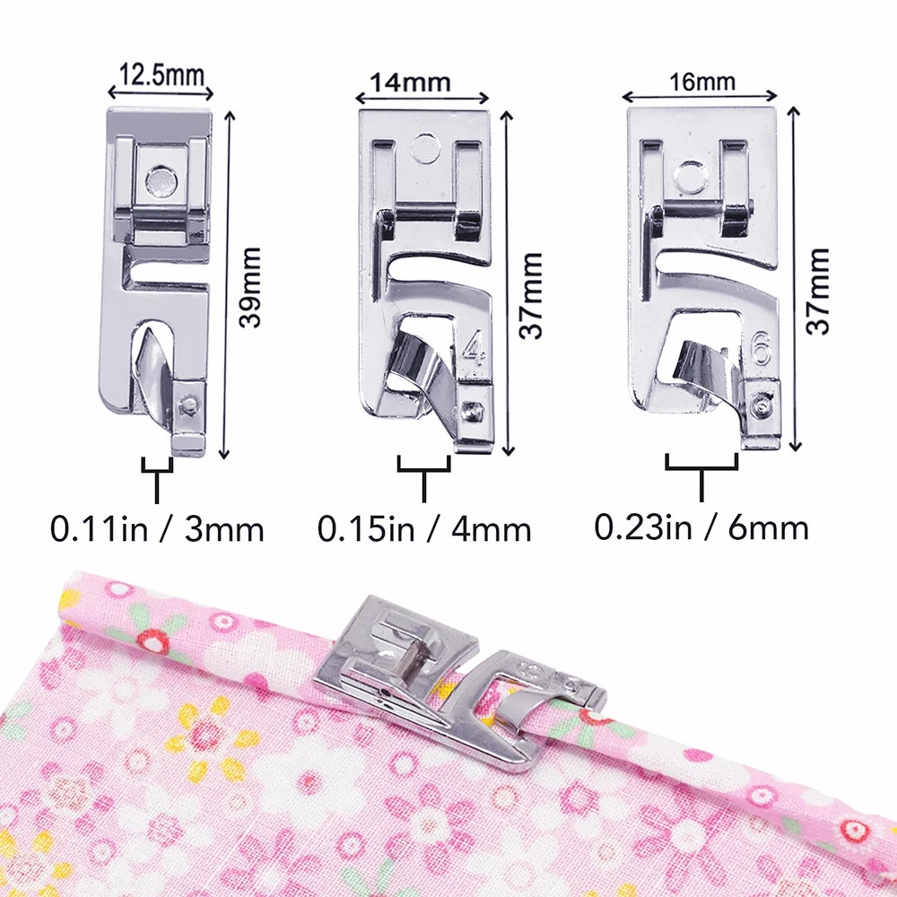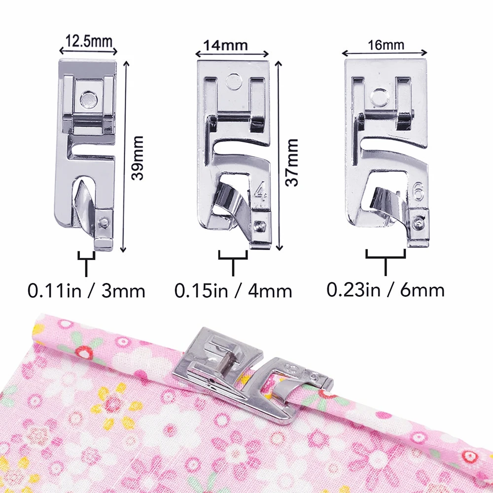 3 разных размера: Эта узкая прижимная лапка для шитья включает в себя 3 размера, поможет вам создать красивый свернутый низ на легкой ткани