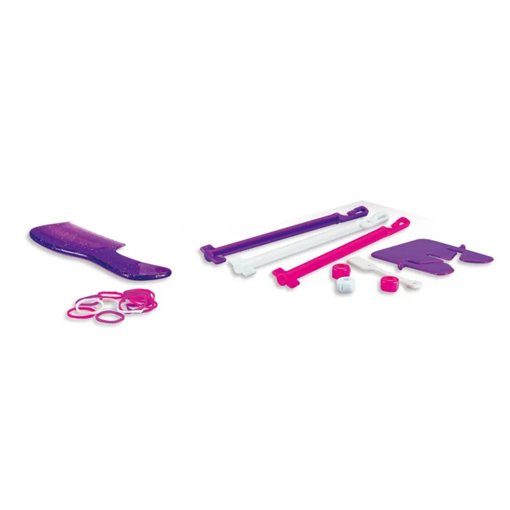 Набор оплеточных устройств содержит оплетку, фиксатор, расческу, фиксаторы для резиновых лент, палочки для волос и резинки.