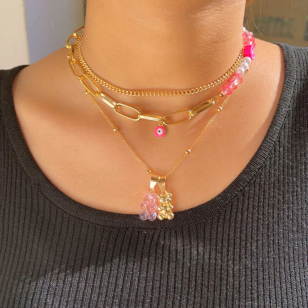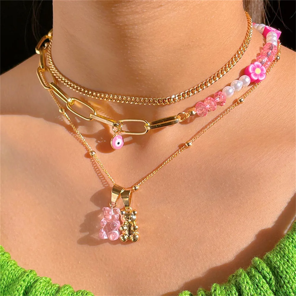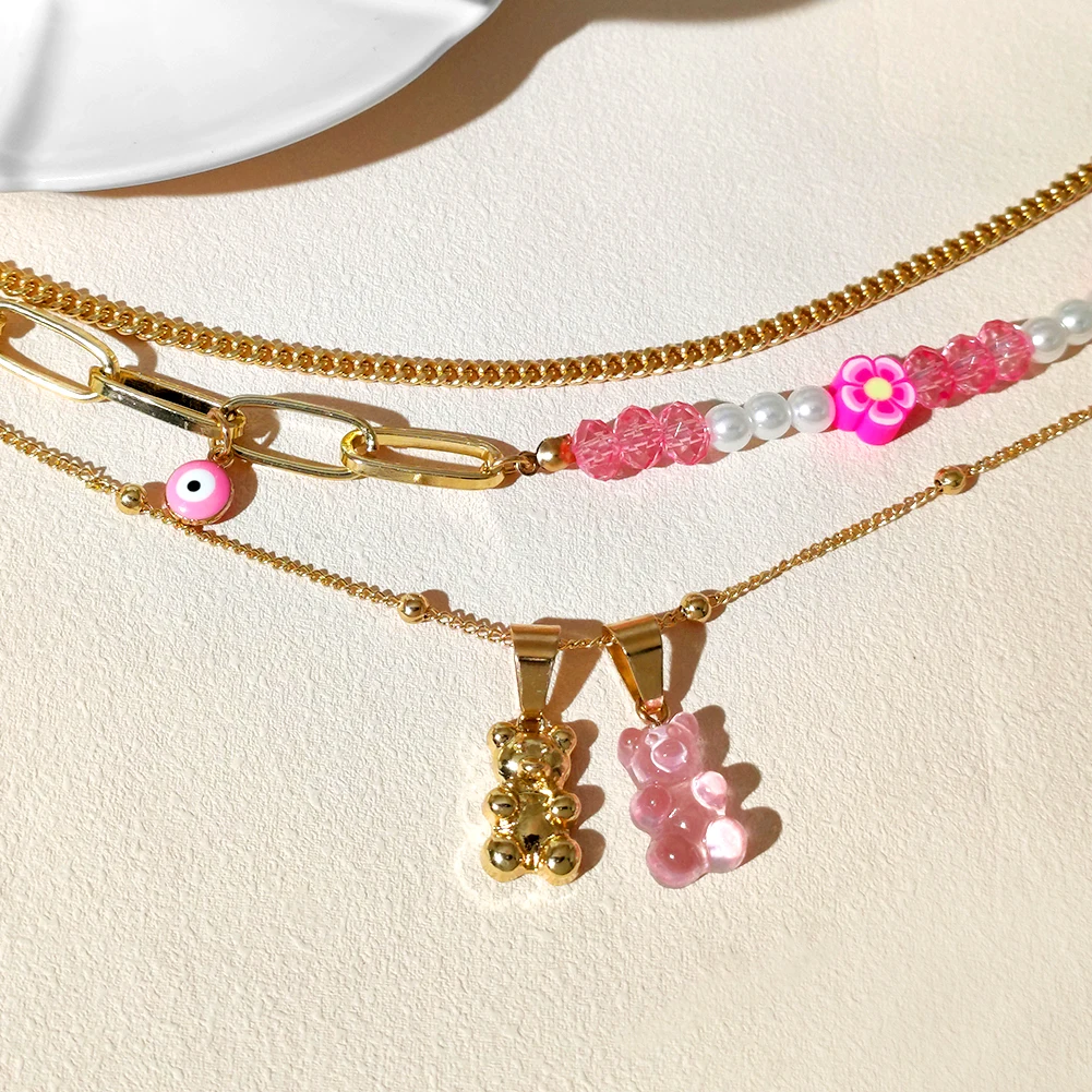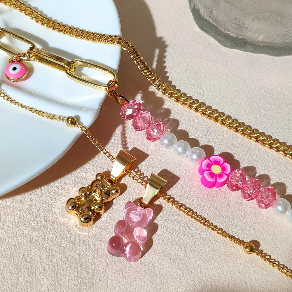Ружовы мядзведзь кветка жамчужны карал з бсеру для жанчын Шматслойныя млыя вочы Залаты металчны ланцужок карал ключыцы колье Модныя ювелрныя вырабы