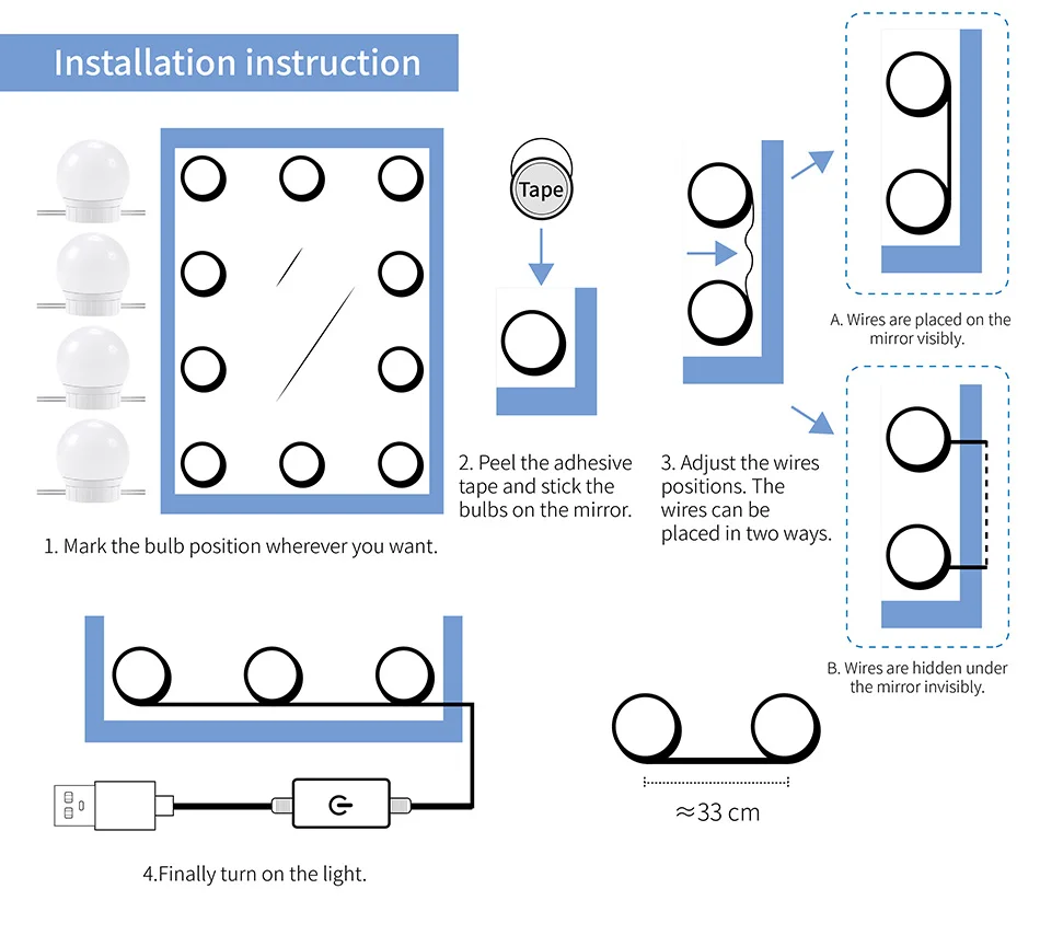*Предусмотрены двухсторонние ленты и присоски, лампочки могут быть непосредственно и быстро наклеены на зеркала с лентами или присосками.