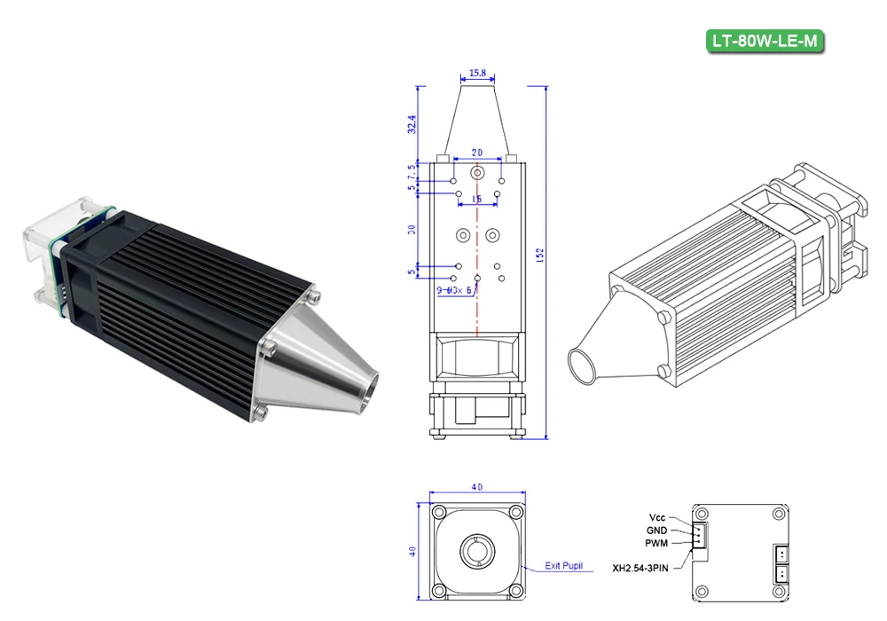 Синий лазерный модуль --- профессиональная лазерная головка с высокой скоростью и высокой стабильностью. Яркий синий светильник, легко найти при резке.