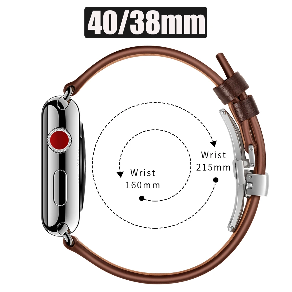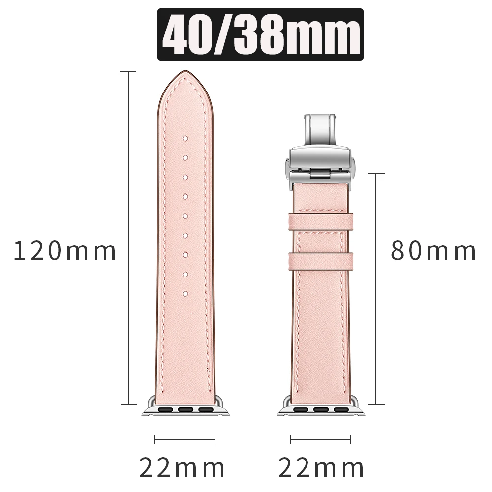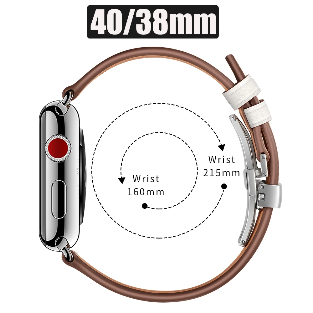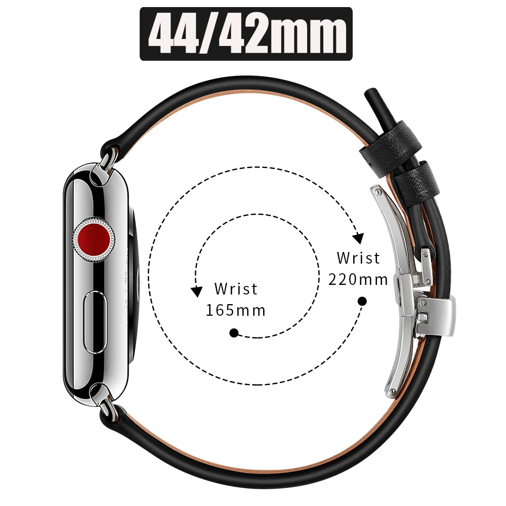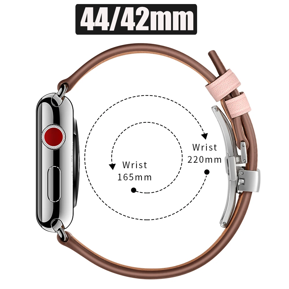 Ремешок для часов Ширина: 40/38 мм, 44/42 ммДлина ремешка: 38 мм подходит для запястья 125-195 мм, 42 мм подходит для запястья 145-215 мм.Материал ремешка: натуральная коровья кожаПряжка для часов: Пряжка-бабочкаЦвет ремешка: коричневый, черный, розовый, белый, абрикосовый