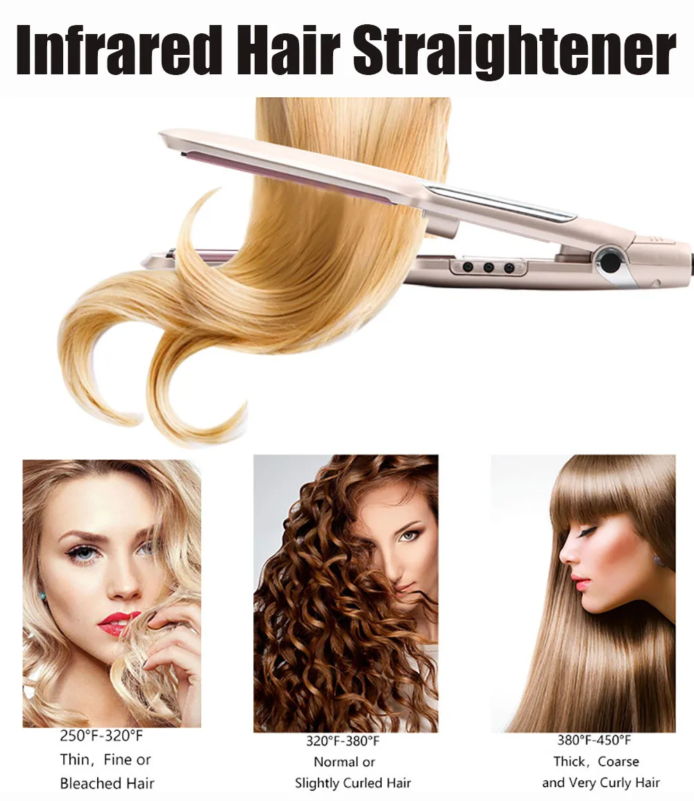 Цифровой выпрямитель для волос с регулируемой температурой: цифровой ЖК-дисплей с регулируемыми 6 температурными настройками 300-450 °/150-235 °. 300-340 ° для хрупких, мягких, тонких, отбеленных волос. 340-380 ° для нормальных, средних, слегка вьющихся волос. 380-450 ° для густых, очень вьющихся, грубых волос.
