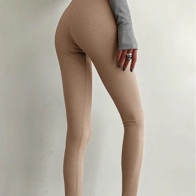 Бежевые трикотажные леггинсы в рубчик, женские хлопковые базовые брюки с высокой талией для фитнеса, повседневные Весенние Новые Универсальные женские облегающие леггинсы