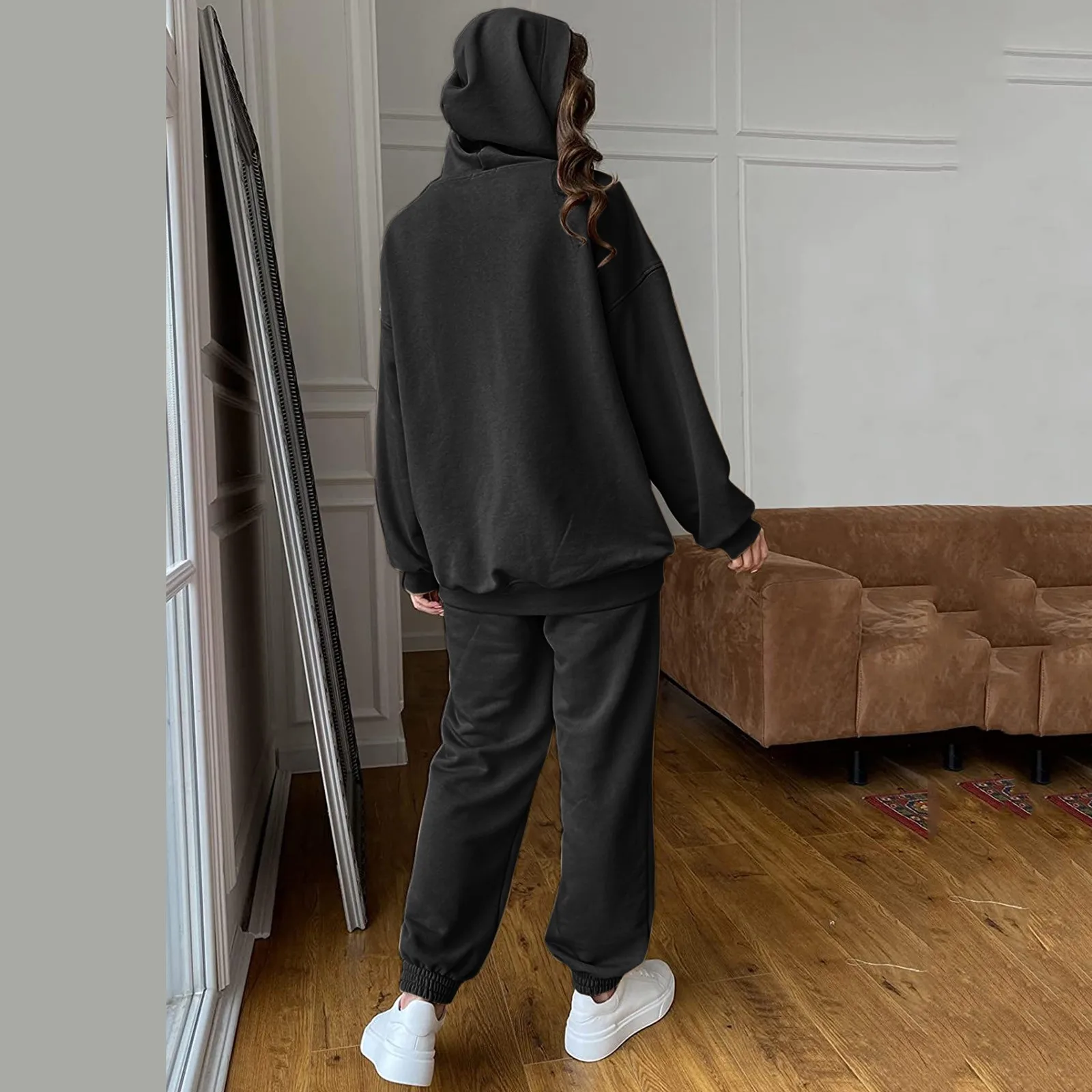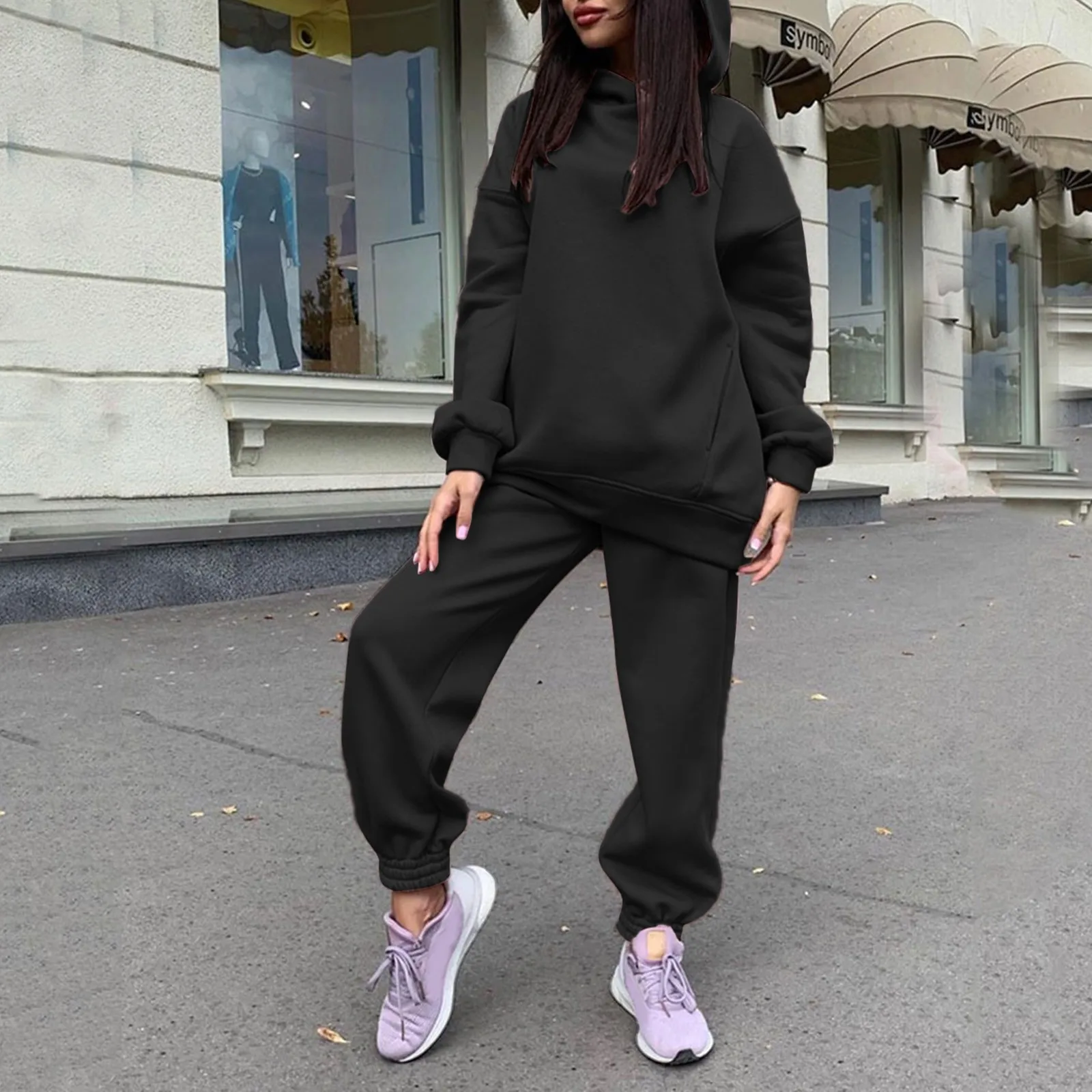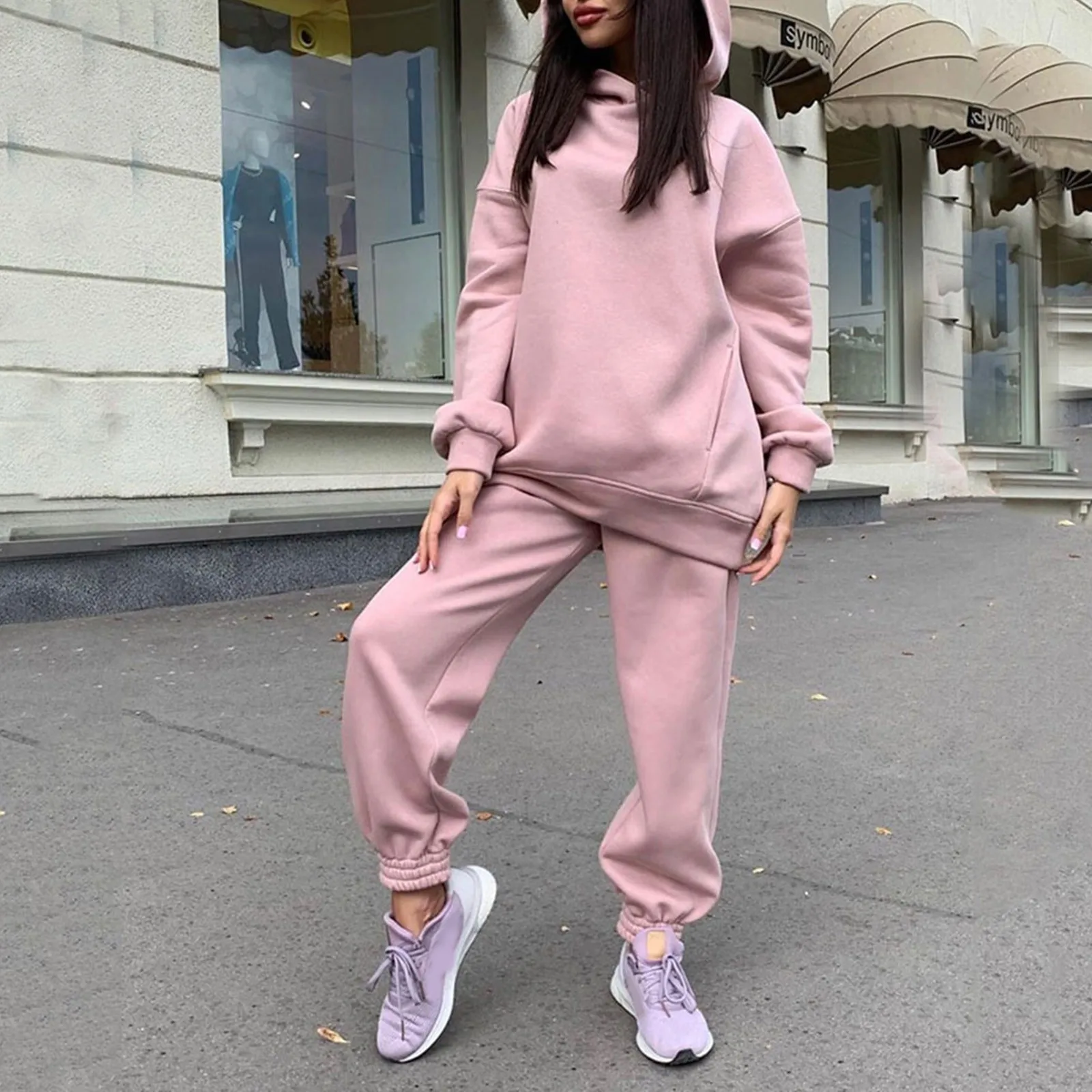 Новый спортивный костюм для женщин, элегантные однотонные костюмы, флисовые теплые толстовки, комплект из 2 предметов, Осень-зима, Модные свитшоты оверсайз, спортивный костюм