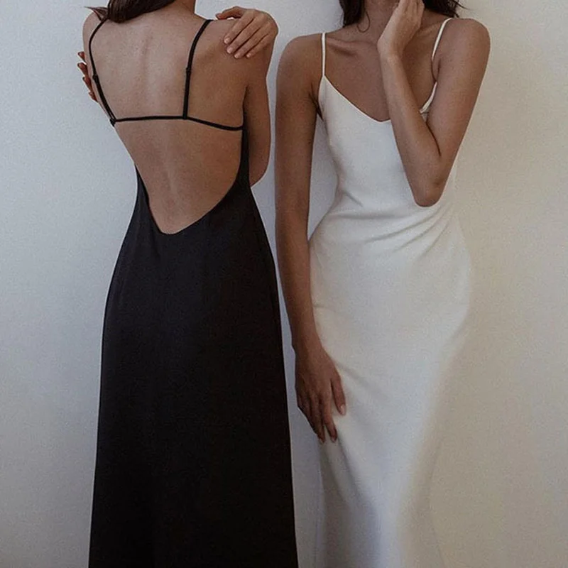 Женское атласное платье на бретелях-спагетти, длинное черное платье-трапеция с открытой спиной, сексуальное летнее платье без рукавов