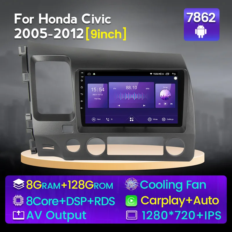 Fellostar 9 ''Android 11 8 + 128G автомобильный радиоприемник, мультимедийный плеер для Honda Civic 2005-2012, беспроводной Carplay 4G LTE, охлаждающий вентилятор, стерео