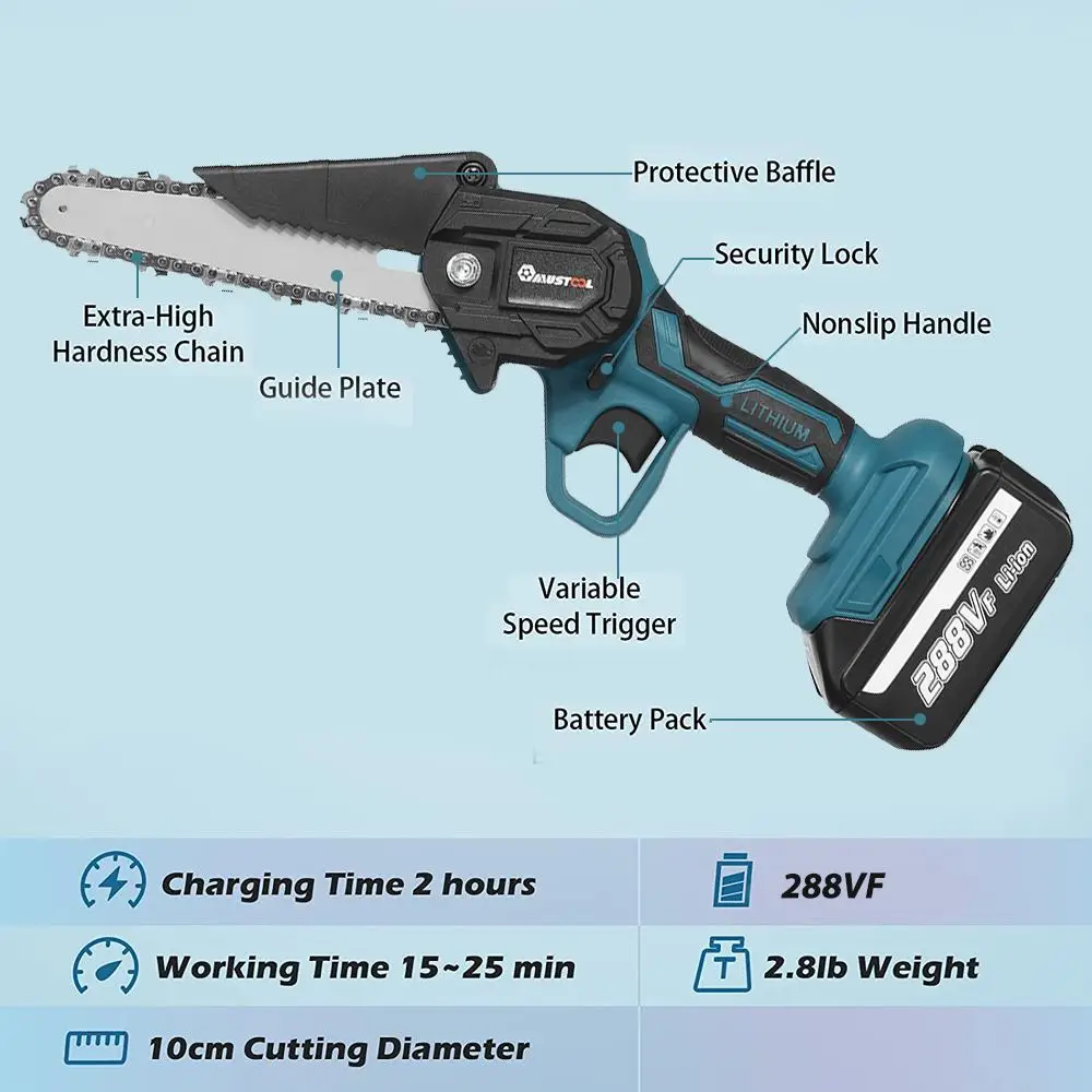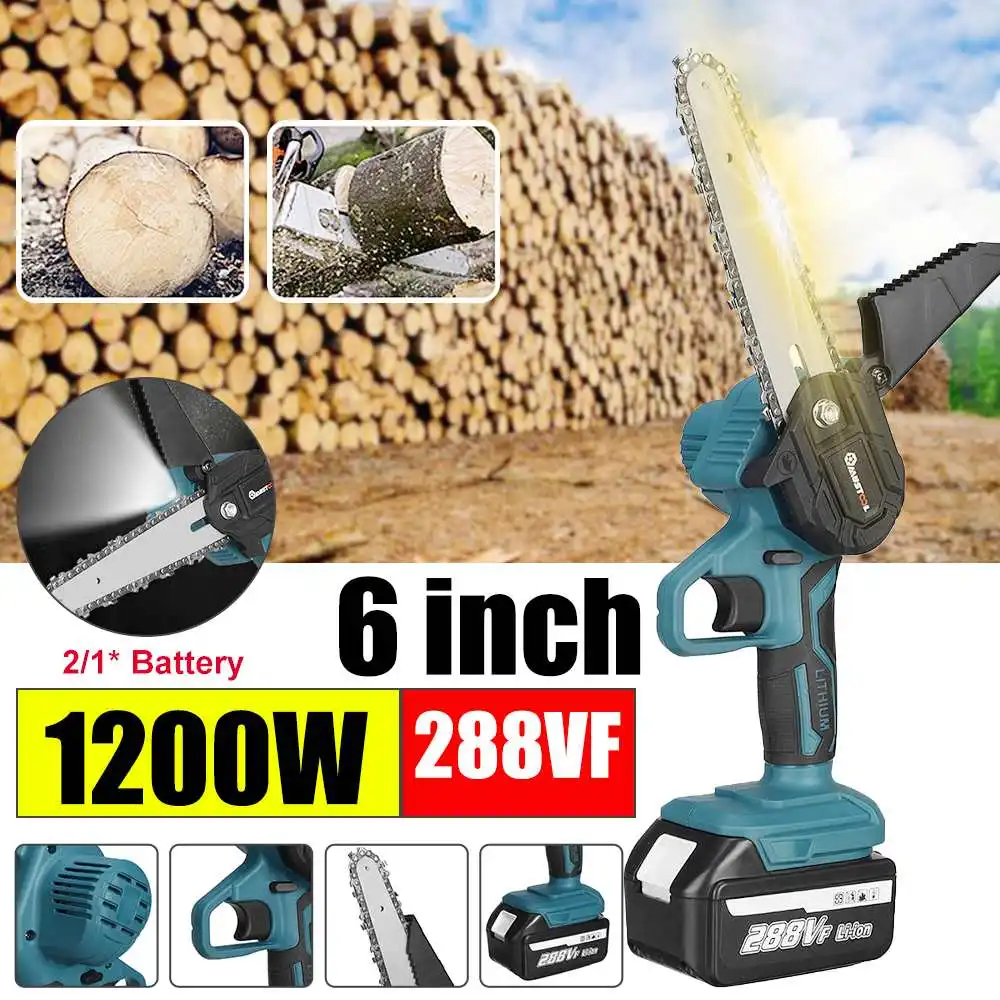 Характеристики:Название: электрическая бензопилаМатериал: АБС + металлБатарея: литиевая батарея, 288VF, 22900 мАч (в комплекте)Мощность: 1200 ВтДлина направляющей пластины: 6 дюймовОсобенности:Перезаряжаемая Электрическая цепная пила, светильник и портативный, длительный срок службы батареи, без повреждений коры.Светильник вес тела, светильник и удобный, светильник вес конструкции, долгое время хранения и не устают руки.Щеточный двигатель из чистой меди, высокая мощность, быстрая резка, повышение эффективности.Практичная, быстрая скорость, низкое энергопотребление.Переключатель отличного качества, быстрая и медленная регулировка, плавное изменение скорости.Интеллектуальная плата управления цепью, защита от перегрузки, для удовлетворения ваших различных потребностей в конструкции.Маленький размер, можно держать одной рукой.Высококачественная направляющая цепь, глубокая закалка, более износостойкая, гладкая резка.Уведомление:1. Допускается погрешность в 1-2 см из-за ручного измерения.2. Цвета могут отличаться, так как на дисплее разница, пожалуйста, поймите.3. Мы отправим вам адаптер в соответствии с вашей страной.