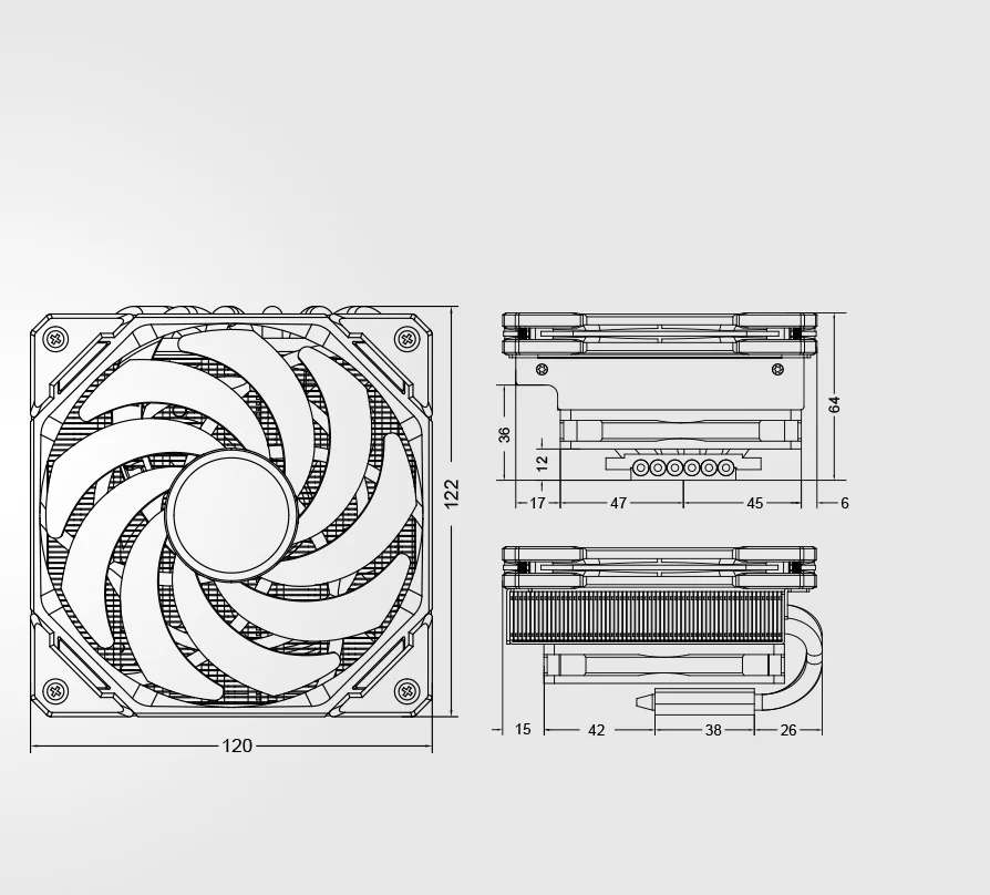 Медное основание + 6 × Ф6 мм медная тепловая труба + алюминиевый ребро