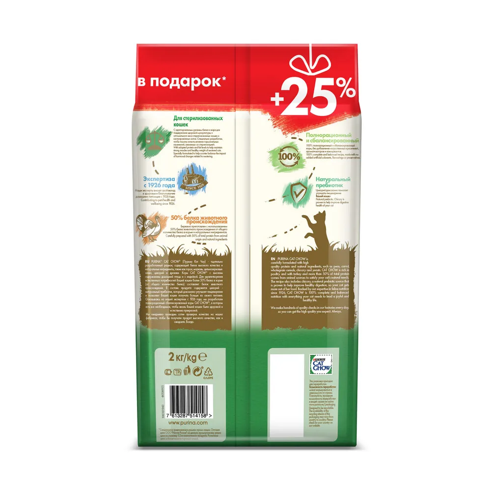 Сухой корм Cat Chow для взрослых стерилизованных кошек, с домашней птицей и с индейкой, Пакет,1,5 кг + 500 г