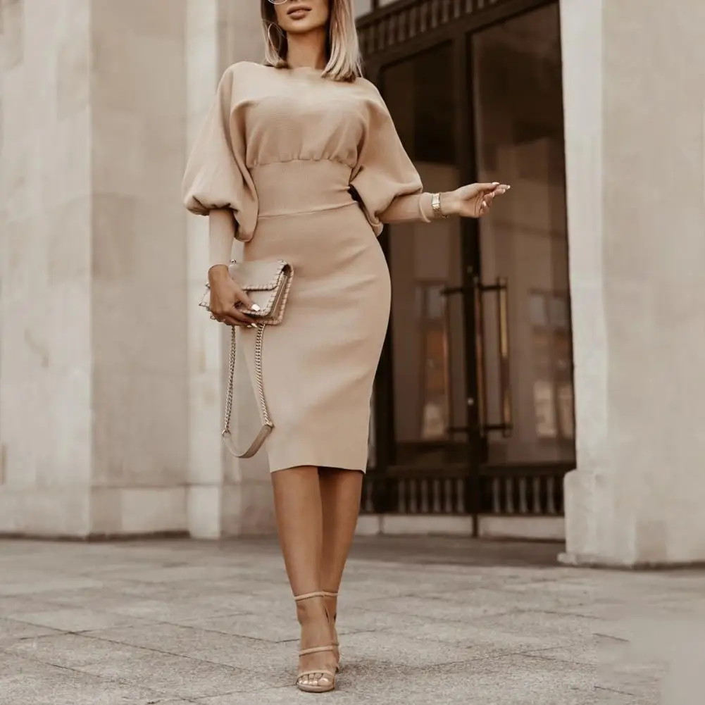 Женское платье с пышными рукавами, облегающее офисное платье до колена с круглым вырезом, однотонное элегантное праздничное платье