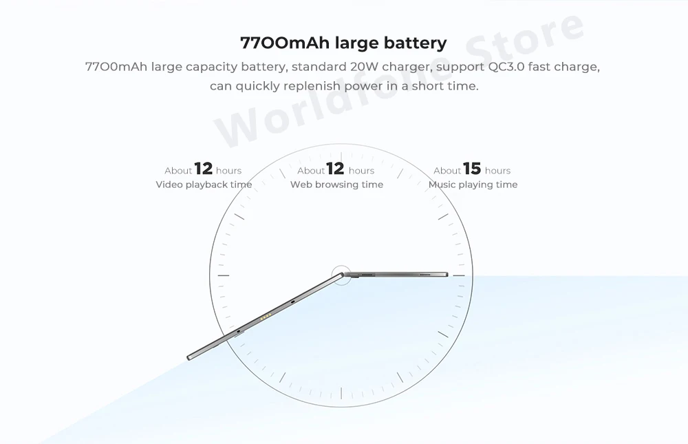Аккумулятор повышенной емкости емкостью 7700 мА · ч, достаточно поддерживает использование в течение всего времени, развивая развлечения, чтобы не беспокоиться о электричестве. Стандартное зарядное устройство 20 Вт, поддержка быстрой зарядки QC 3,0, короткое время может быстро добавить емкость, уменьшить ожидание.