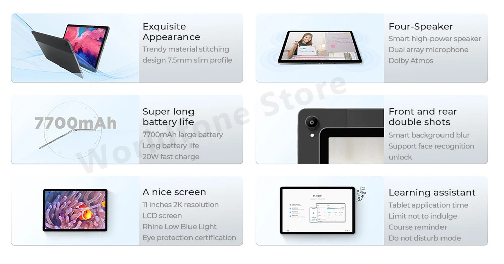 1: В настоящее время материал шитья дизайн 7,5 мм тонкийФорма2: интеллектуальная высокомощная Двухдиапазонная Громкая связьМикрофоны, прозрачный панорамныйКачество звукового шока3: аккумулятор 7700 мАч для длительного срока службы 20 ВтЗарядка для уменьшения ожидания зарядки4: Интеллектуальный размытый фон для лицаРаспознавание5:11 дюймов 2 k разрешение ЖК Рейн низкий синийСертификация глаз6. Ограничение по времени применения планшетаНапоминает housekeeperYou один режимНе отвлекается в классе
