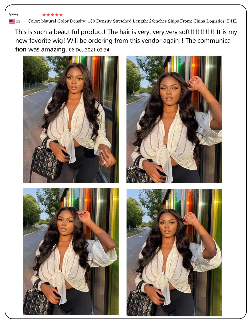 Я купил этот парик для особого случая, я сказал продавцу, мне он нужен срочно, они убедились, что смогу получить его вовремя. Честно говоря, эти волосы такие замечательные и доступные! Я действительно шокирован тем, насколько хорошо. Волосы очень мягкие на ощупь и не имеют запаха. Мне нравится красивая текстура, локоны очень мягкие и хорошо держатся. Волосы полны и не запутываются. Я получил много комплиментов независимо от того, когда ношу их! Я настоятельно рекомендую и, безусловно, буду покупать их волосы снова.