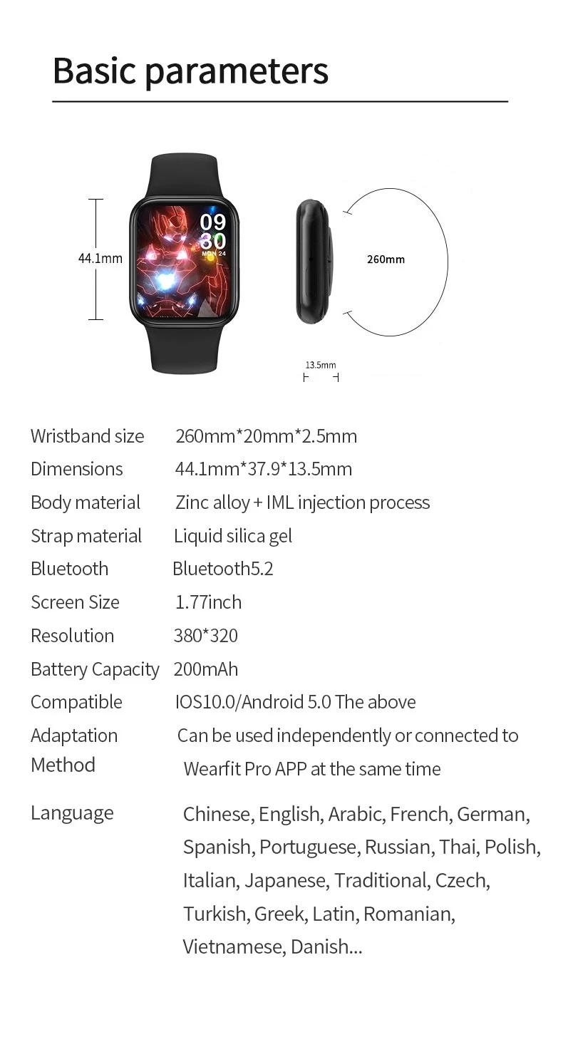 Параметры продукта1. Модель: M26 Plus2. Размер: 44.1x37.9x13.5мм3. Материал корпуса: цинковый сплав4. Материал ремешка: силикон5. Экран Размер: 1,77 дюйм (ов)6. Чип: HS66217. Датчик сердечного ритма: SC7R308. Память: 128 м9.BT: 5,210. Емкость аккумулятора: 200 мАч11. Метод зарядки: Беспроводная зарядка12. Срок службы батареи: 1-3 дня13. Время работы в режиме ожидания: около 10 дней14. Водонепроницаемость: IP6715. Применение: WearFit pro16. Системные требования: Android 5,0 и IOS 10,0 и выше