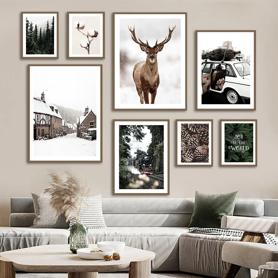 Сосновые шишки лист поезд Снежный лес дом настенная живопись холст ...