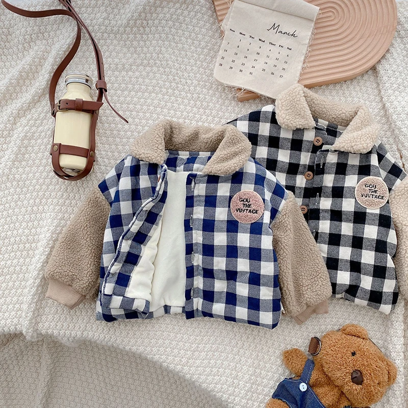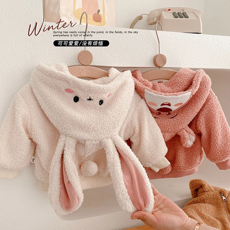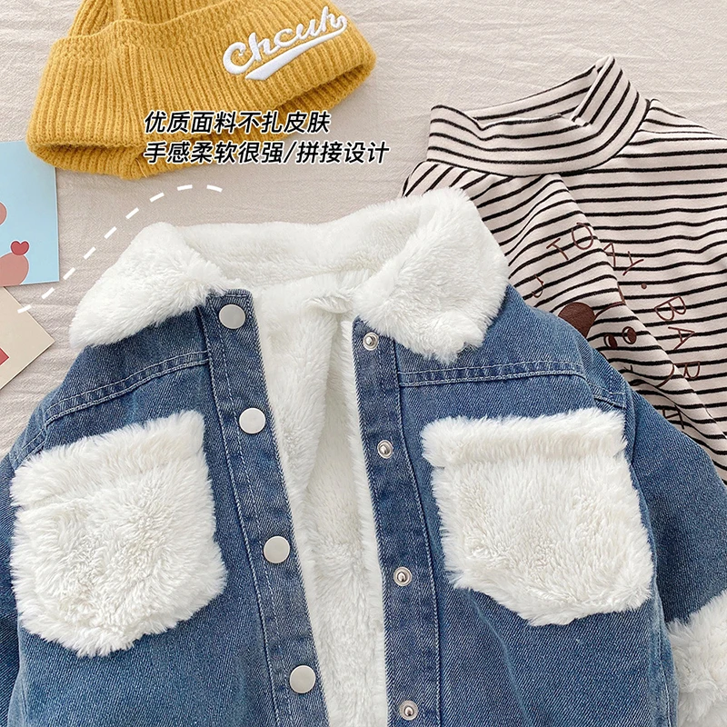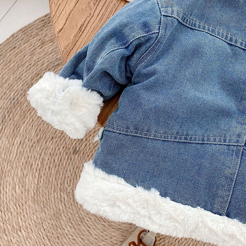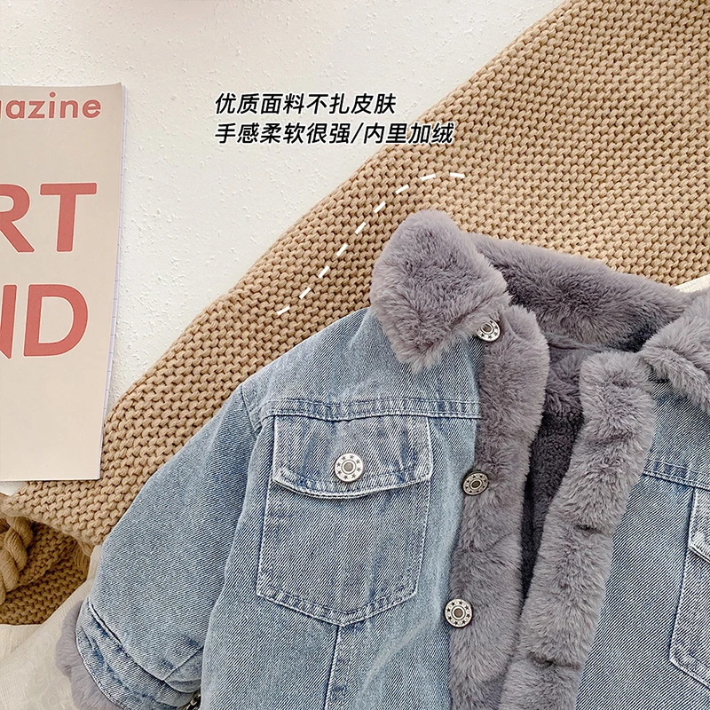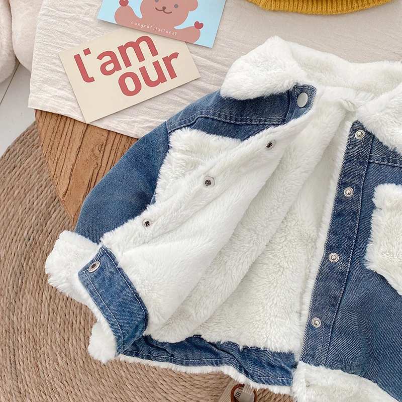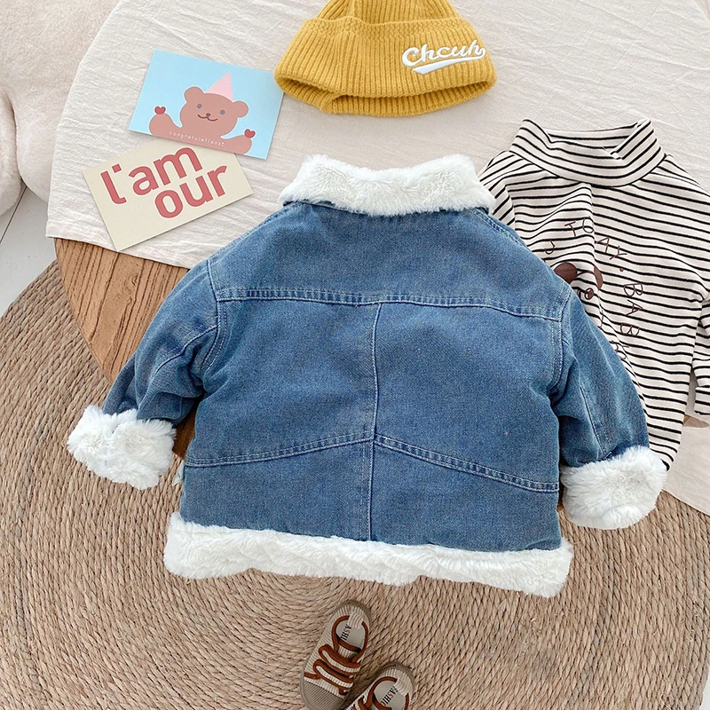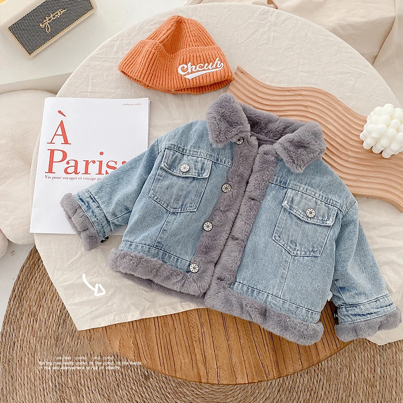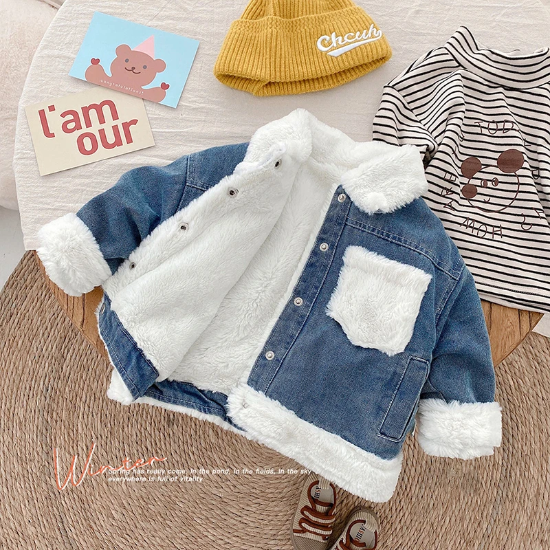 Джинсовая куртка для маленьких девочек, Детское пальто, одежда для малышей, корейские зимние куртки с бархатной подкладкой для девочек и мальчиков, утепленная детская верхняя одежда